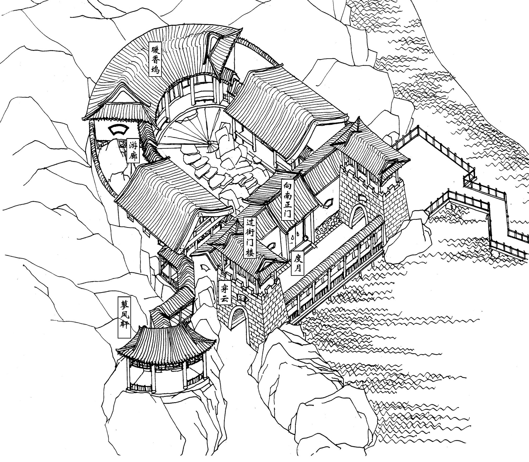 那日贾母“坐了竹椅轿,大家围随,过了藕香榭,穿入一条夹道,东西两边皆有过街门,门楼上里外皆嵌着石头匾,如今进的是西门,向外的匾上凿着‘穿云’二字,向里的凿着‘度月’两字。来至当中,进了向南的正门……从里面游廊过去,便是惜春卧房,门斗上有‘暖香坞’三个字。早有几个人打起猩红毡帘,已觉温香拂脸。”果然是暖和的,不枉了“暖香坞”的令名。暖香坞的建筑形制也从中可见一斑:正门前是一个夹道,左右有过街门楼,门楼为门上起楼,是来增加气势以示壮观的,其中西门楼内外分别刻着“度月”“穿云”的匾额,依据作者惯有的无处不象征的手法,这里建造起繁复的门楼,大概是象征风花雪月的波澜壮阔,不易穿越。惜春不看破它,也就无由出家。进了正门后,两侧亦是游廊,从游廊穿过去,便到了惜春的卧房暖香坞。