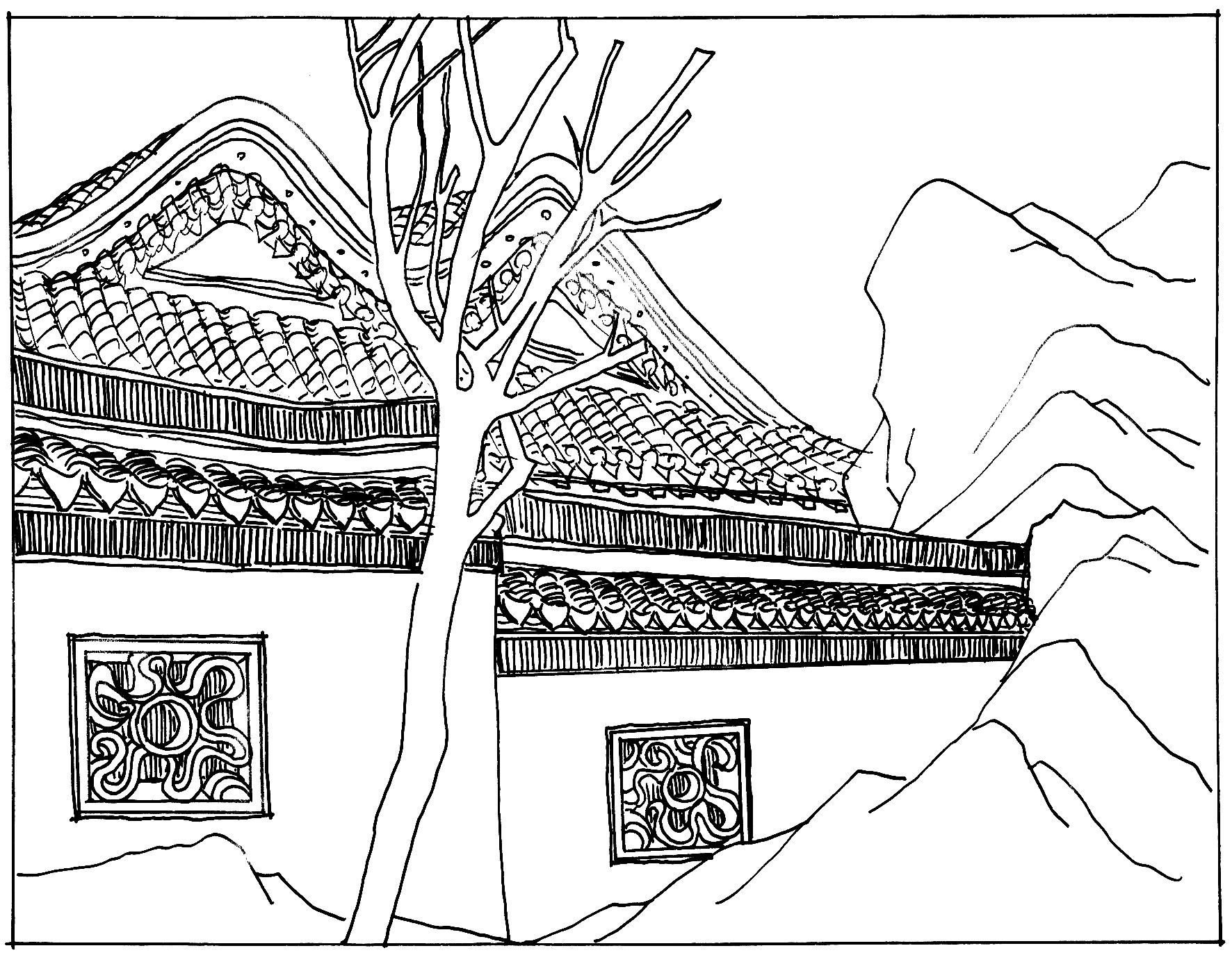 度过柳荫中露出的折带朱栏板桥,往前,便见“一所清凉瓦舍,一色水磨砖墙,清瓦花堵,那大主山所分之脉,皆穿墙而过”。外表看去,建筑的形制和材质均无甚特奇之处,所以贾政毫不客气地批评说:“此处这一所房子,无味的很。”——此句只是曹公的写作技法,“先故顿此一笔,使后文愈觉生色,未扬先抑之法。”(脂砚斋批语)其实,蘅芜苑的外观是经典的款式与样貌,有其固有的深刻传统,绝非“无味”一语可抹煞的。清凉瓦舍、水磨砖墙、清瓦花堵,简洁,浑朴,不事雕饰,是为本真。又有山脉穿墙而过,墙体的一部分借了一脉山体,陡增峥嵘奇崛之气,经典的形态中增添了许多意想之外的新鲜和奇趣,这正是宝钗性情的很好说明。
