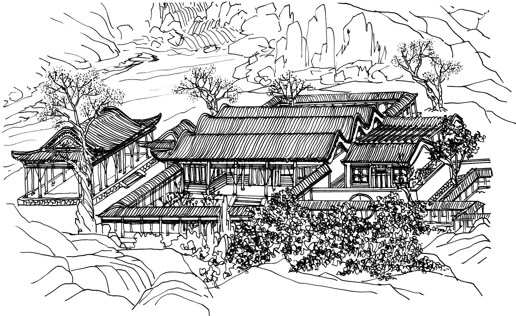 圆明园“西峰秀色”的卷棚屋顶样式。“西峰秀色”为圆明园十景之一,