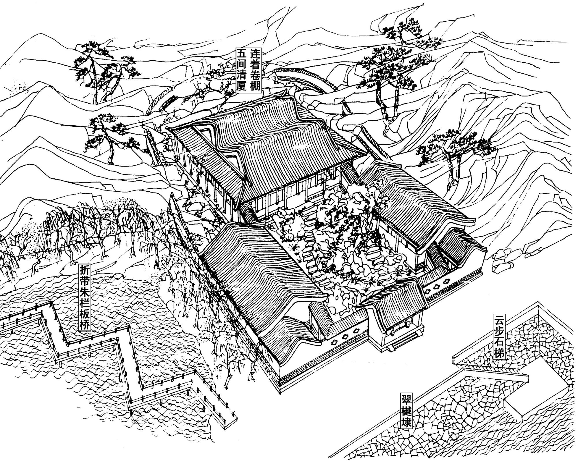 过了“沁芳亭”“有凤来仪”“杏帘在望”三处,缘径循泉,一路来到萝岗石洞。此处并无舟楫可渡,只能攀藤援树,“从山上盘道上去”。宝钗的蘅芜苑赫然出现眼前。