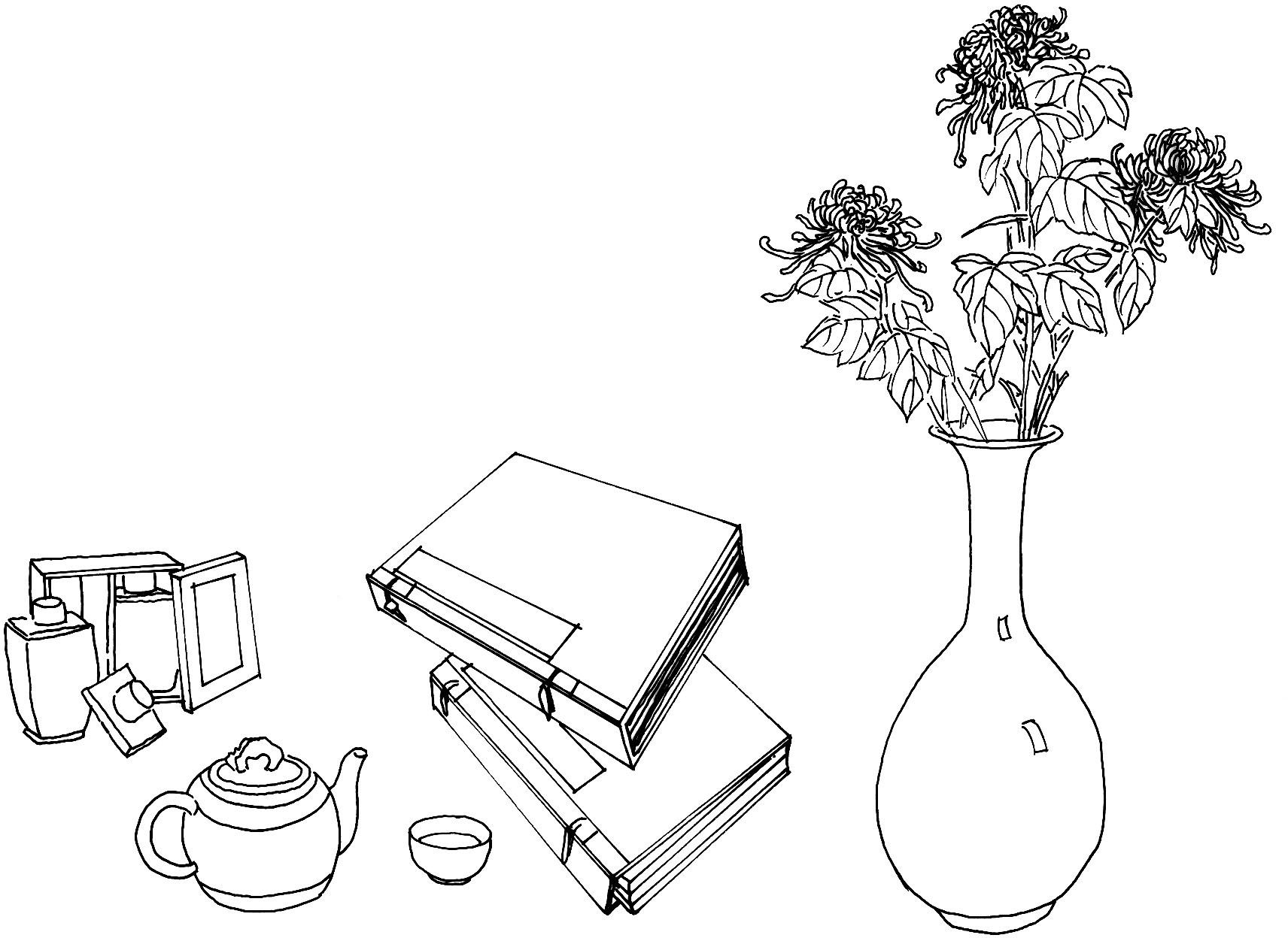 宝钗案上的陈设:茶奁、茶杯、两部书、供着数枝菊花的土定瓶