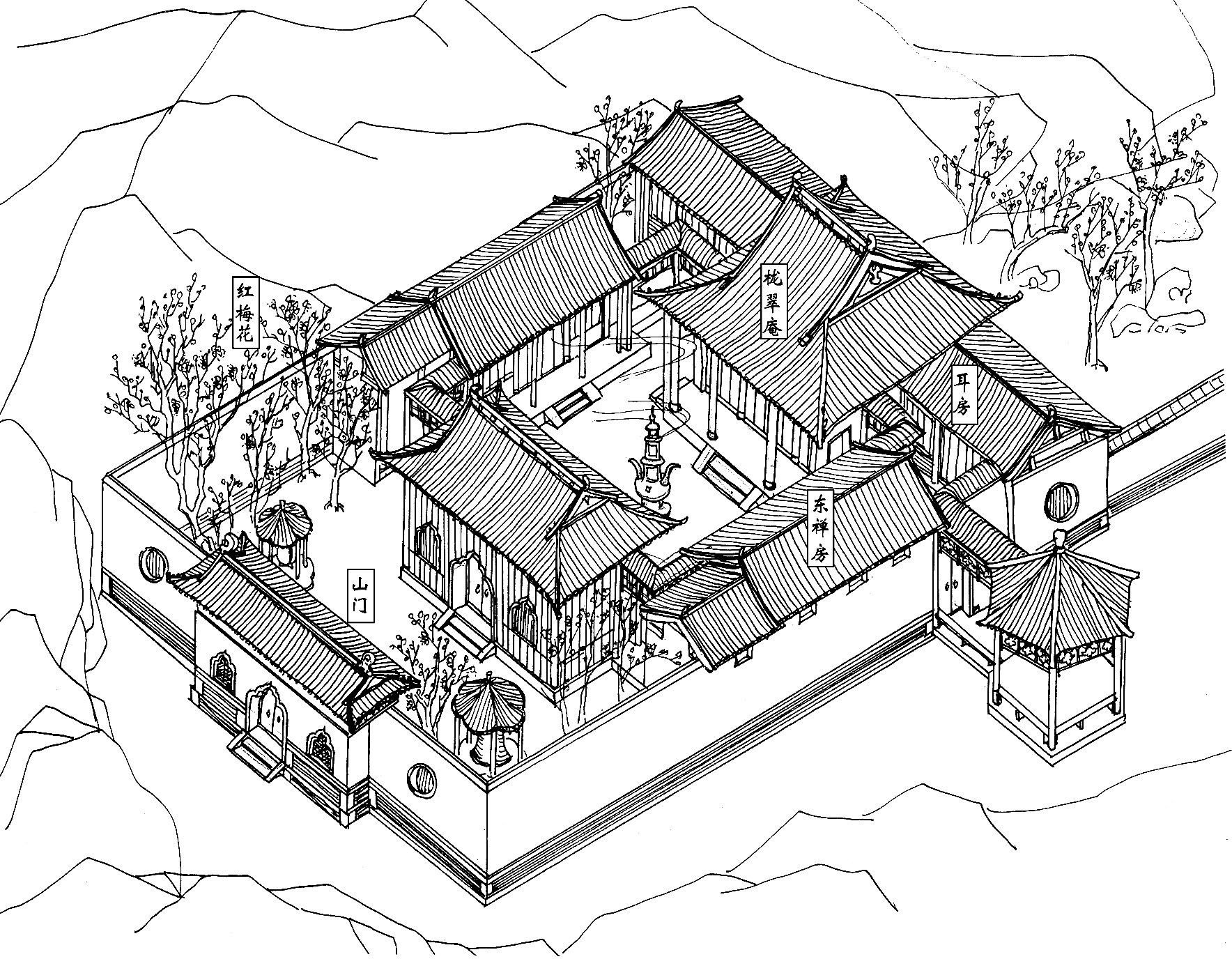 “栊翠”作为庵名,至第四十一回才正式出现。贾母来游时,曾见庵外花木繁盛。庵堂静隐在平和从容的山林气氛里面,形制却是整肃规范的,由院墙及山门围合而成,里头绿意蓊郁,青烟缭绕。