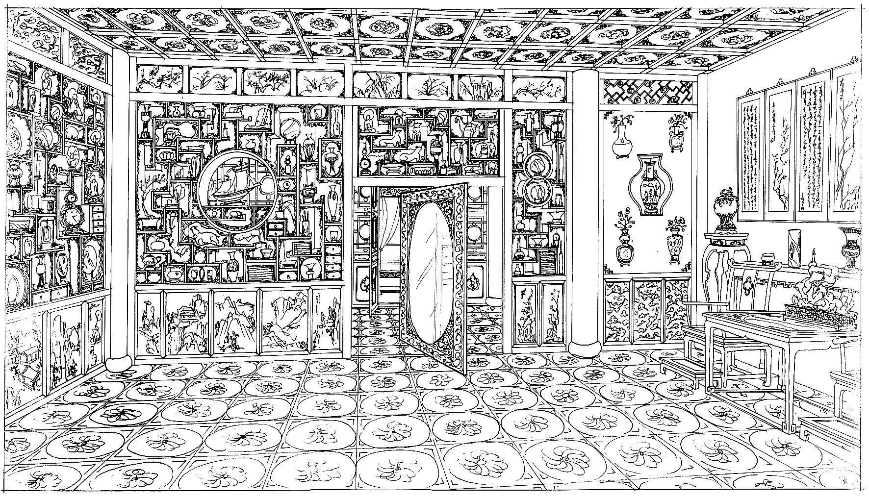 且满墙满壁,皆系随依古董玩器之形抠成的槽子,诸如琴、剑、悬瓶、桌屏之类,因此物件虽悬于壁,却都深嵌在槽内,与壁相平的。这样做却不为节省空间,而是要不遗余力地打造立体空间,将所有的方位全部一一修饰到,是一种大汗淋漓、呼呼直喘的富贵,无所不到,无处不在,让人的视线无处闪躲,就要用这富贵闪死你的眼睛。直到头晕目眩的众人都大赞道:“好精致想头!难为怎么想来!”它还不罢休,倏尔五色纱糊就,竟系小窗;倏尔彩绫轻覆,竟系幽户,看得人头昏脑涨。门窗本为清净通畅之属,这里却毫无收敛的意思,愈发五彩缤纷、光怪陆离起来,叫“小窗”“幽户”未免太谦虚,说是“绣窗”“绮户”也绝不为过。更连地下踩的砖皆是“碧绿凿花,金彩珠光”的,愈发了不得。清代家具便有此弊,造型喜新奇,修饰尚繁缛,一切都来不及了一样,能雕饰的地方全雕上,塞得满满的才叫痛快似的,以致多成为赘疣和笑料。这样拍着胸脯子的炫富,像是暴发户的形状,宝玉房间虽有精致想头,却不免有此弊之嫌疑。