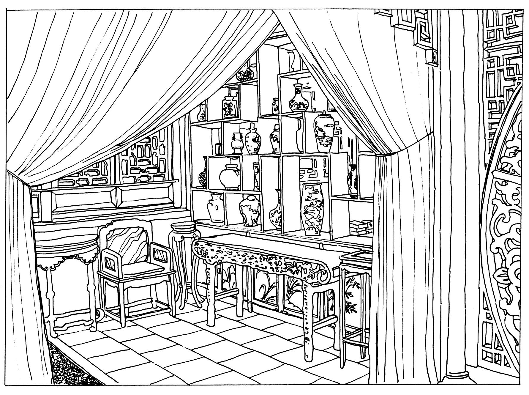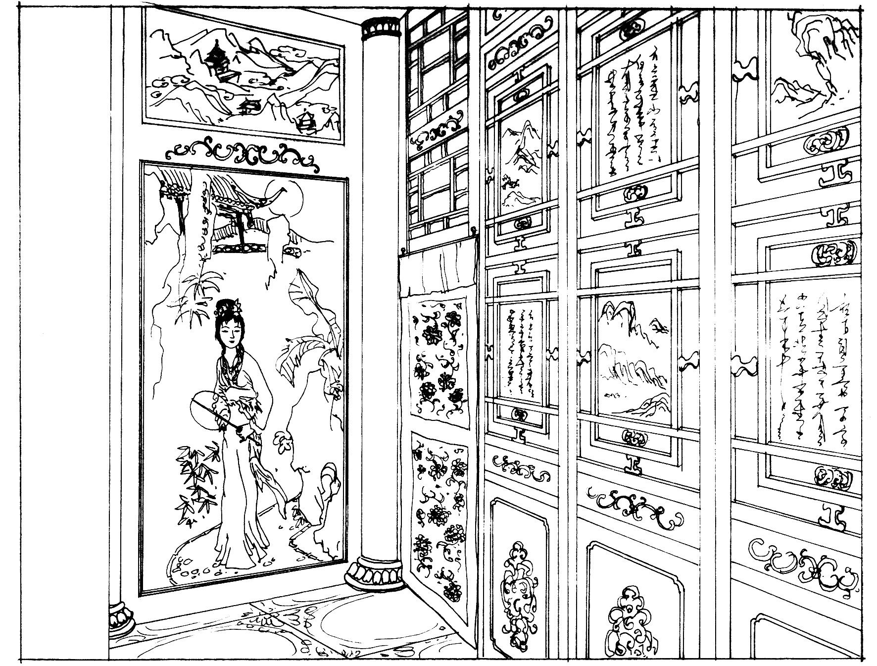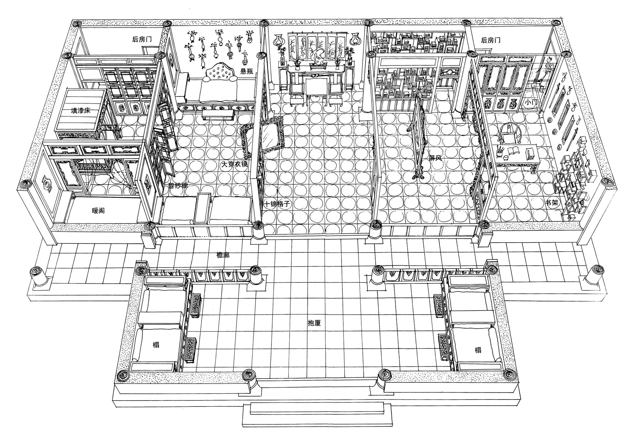 东面两间是书房,格局就疏阔了些,隔断没有西间那样固定,基本上是靠花罩分隔空间。在次间与明间的花罩入口处,摆着一座屏风,以防室内一览无余,缺乏层次感。梢间是宝玉书房,满屋都是书架。此间有门可通往后院,挂着“葱绿撒花软帘”,刘姥姥酒醉糊涂,误打误撞,正是从这后门进来的。进来时只见一个女孩儿满脸含笑迎将出来,刘姥姥“跟她嘀咕半日不见答应,便赶上来拉手,却咕咚一声撞到板壁上,细瞧瞧才看出是一幅画,活凸出来的一样,却又是一色平的”,则见后门入口处是一幅油画仕女图。