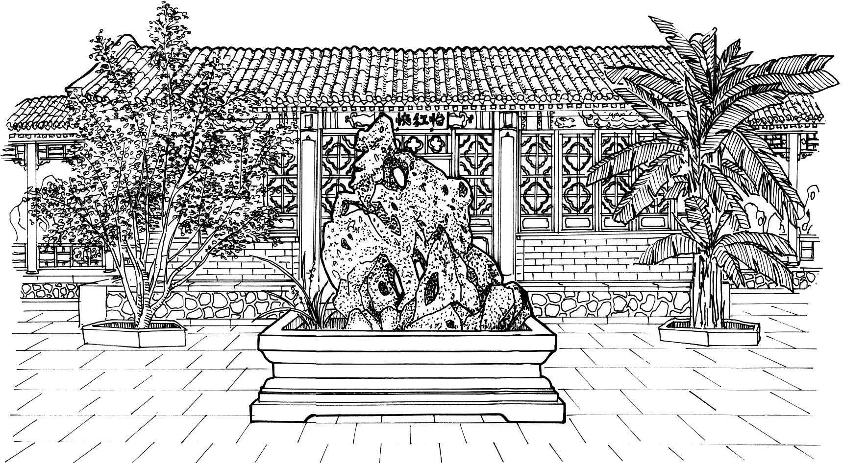 怡红院,果然就与众各殊。一入院门,两边是游廊宛转相接。院中点衬几块山石,一边种着数本芭蕉,阔大叶脉,鲜绿肥厚,有玉的光泽;再远几棵松树,两只仙鹤在树下闲在剔翎,令人有出尘之想。另一边则是一棵西府海棠,其势若伞,丝垂翠缕,葩吐丹砂,唤作“女儿棠”,说是来自“女儿国”,云彼国此种花最盛产。虽然心知不过是传说罢了,但总归是不寻常有异质,才有可能成为传说。既是“女儿棠”,自然要养在怡红院中,别处风土养护恐不如此处精细贴心——须知宝玉才是第一等护花惜花之人。他眼里看这花,觉其色“红晕若施脂,轻弱似扶病,大近乎闺阁风度”,必会青眼相待、好生扶养的。脂批于此处叹道:“若海棠有知,必深深谢之。”