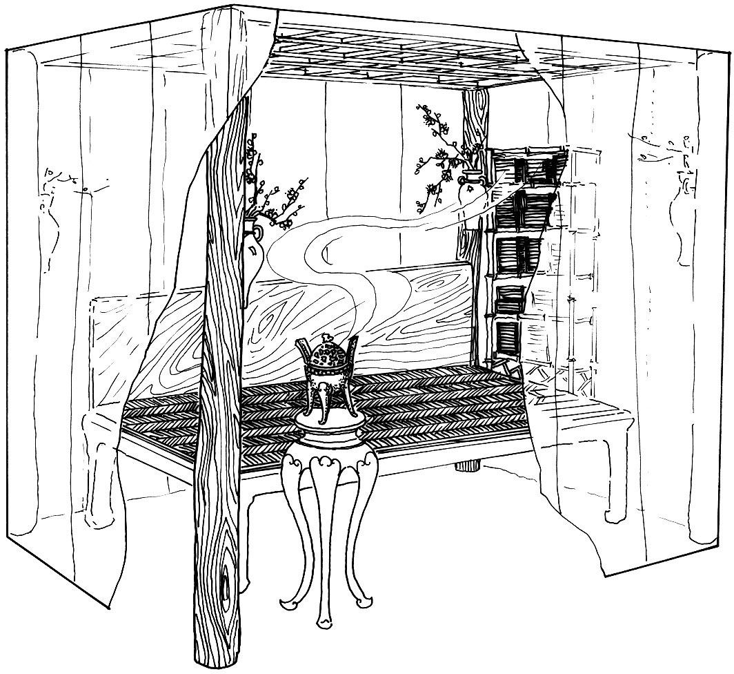 帐幔是古代居室内不可或缺的东西,它的质地和美饰程度,直接影响到居室整体的氛围和情调。《红楼梦》里多处提到帐幔,如“藕合色花帐”“绣帐”“绡帐”“鲛绡帐”等,无不是富贵人家的气度。“鲛绡帐”还有个神话的来源,更能说明其富贵之非同一般:“南海出鲛绡纱,泉窒(指鲛人)潜织,一名龙纱,其价百余金。”秦可卿房中挂着“同昌公主制的联珠帐”,同昌公主是唐懿宗李漼的女儿,“联珠帐”是用珍珠串起来的帐子。唐苏鹗《杜阳杂编》里记载:“咸通九年,同昌公主出降,宅于广化里,锡钱五百万贯,更罄内库珠宝,以实其宅……堂中设连珠之帐,却寒之帘,犀簟牙席。龙凤绣联珠帐,续真珠以成也。”可见其豪奢程度。怡红院宝玉床上挂着“大红销金撒花帐”,晴雯睡的暖阁则垂着“大红绣幔”,色彩鲜艳明快,纹饰富丽,与人物性情的鲜亮痛快颇有关联;探春的拔步床上悬着“葱绿双绣花卉草虫纱帐”,葱绿色不张狂,表里两面都绣有花卉草虫则清新淡雅;宝钗床上吊着“青纱帐幔”,贾母认为过于素净,不像大家气度,命令鸳鸯拿来一幅“水墨字画白绫帐子”替换掉,这帐子绫白如雪,墨含五色,有水墨飘逸清雅的特质。蘅芜苑过于素朴简单,在贾母看来便是个缺陷,她选择了这顶“水墨字画白绫帐”而不是绣帐,首先是尊重蘅芜苑整体的素洁品质,同时又以其不凡的质地和纹饰,来弥补和改善这一气质,这一着是巧妙而智慧的,在调节其过重的朴素之上,更新了视觉环境,扩充了室内素雅的内涵。