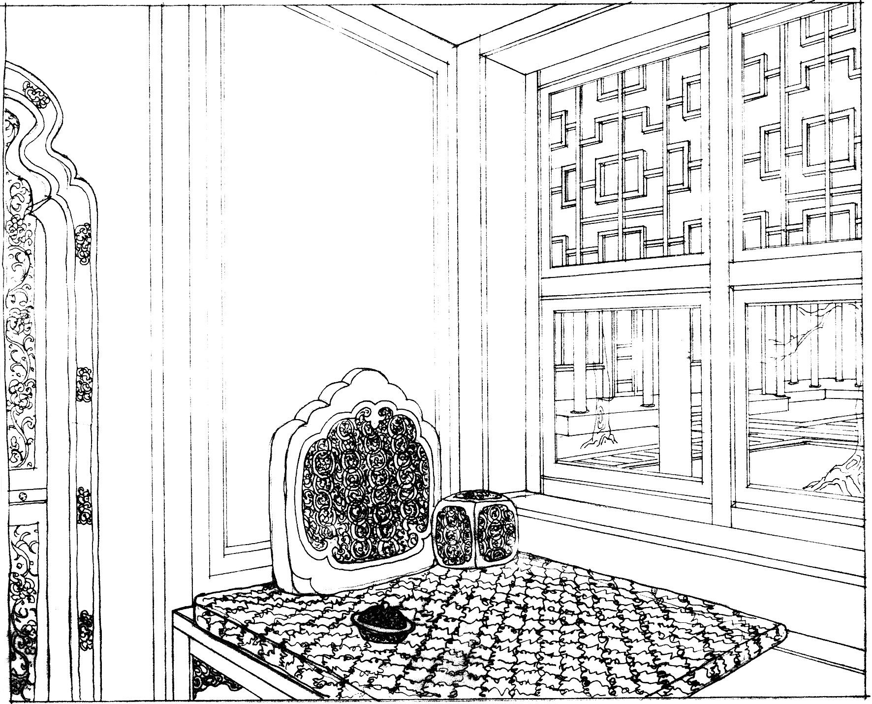 这里呈现的正是寻常居家时候的炕居生活,主人盘坐于炕上,可以看书、休息、睡觉。夫妻可对坐于炕桌两侧,聊天喝茶,谈论些琐事,舒适悠闲,也可撤去靠背炕几,铺上被褥,就寝休息。