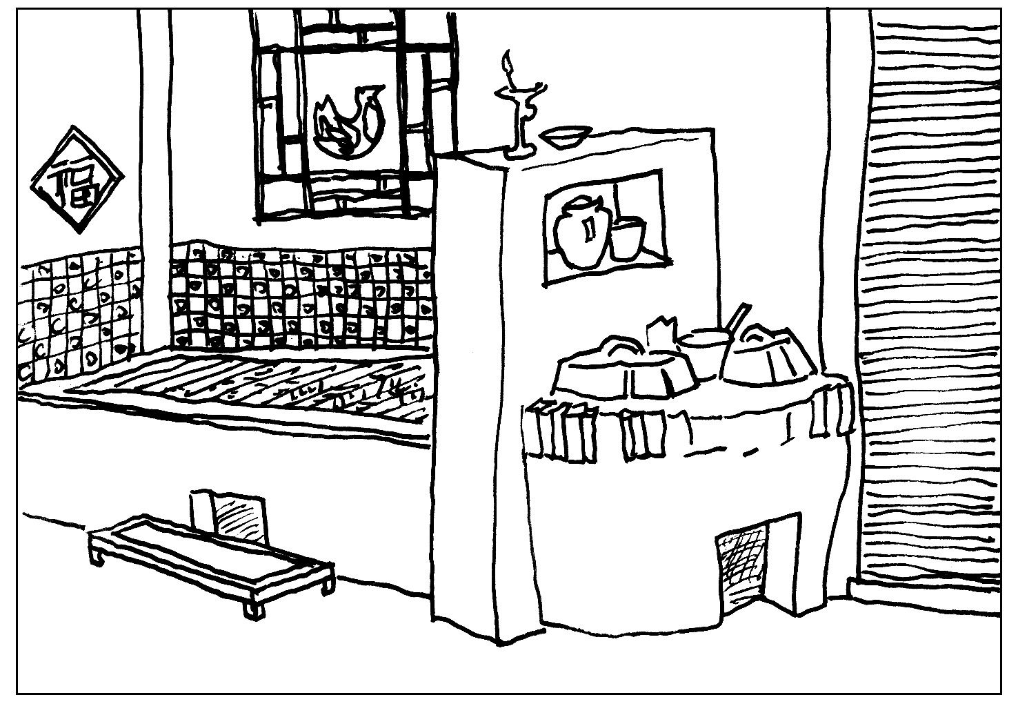 这古老的炕,包含着现代科学中传热、散热、管道等专门学问在里头,是有很深的智慧的根基的。贫寒人家能够用上这种简陋的土炕就已经很不错了,他们通常一家大小都睡在一张炕上,无力做更多的修饰和美化,顶多是油上一层漆。炕上的铺设也很粗陋,若炕是没油漆过的,最下面就铺一条苇席,上面再铺些粗淡被褥而已;更不济的,就只有炕席一条,再无其他东西了。书中第七十七回写晴雯被逐出大观园后,卧病其姑舅哥哥家,宝玉去探望时,发现昔日心比天高的晴雯睡在铺了一领芦席的土炕上,宝玉心疼得潸然泪下。为了经济实惠,炕也通常和炉台结合设计,旧时北京形容人家清苦,就常说一句“锅台连着炕”的俗谚。在烧饭时,可利用烧饭的热力来暖炕,一举两得。书中写晴雯要茶喝时,茶壶就在炕头的炉台上,可见这里的炕也是灶炕一体的。