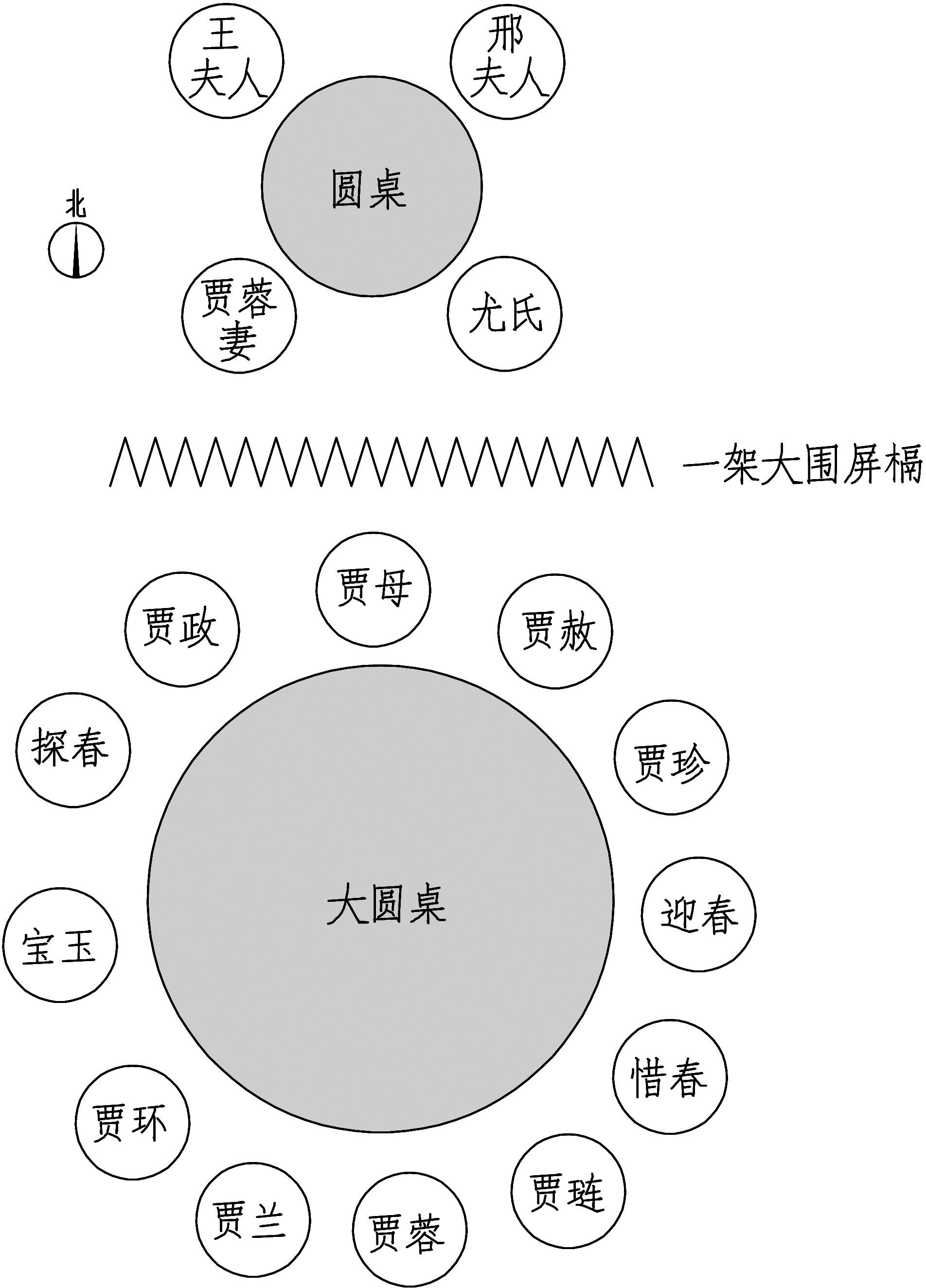 第七十五回记述荣国府中秋赏月的大型家宴,安排在大观园的凸碧山庄里:“于厅前平台上列下桌椅,又用一架大围屏隔作两间。凡桌椅形式皆是圆的,特取团圆之意。上面居中贾母坐下,左垂首贾赦、贾珍、贾琏、贾蓉,右垂首贾政、宝玉、贾环、贾兰,团团围坐。只坐了半壁,下面还有半壁余空……于是令人向围屏后邢夫人等席上将迎春、探春、惜春三个请出来。贾琏宝玉等一齐出坐,先尽他姊妹坐了,然后在下方依次坐定。”第七十六回:“话说贾赦贾政带领贾珍等散去不提。且说贾母这里命将围屏撤去,两席并而为一。众媳妇另行擦桌整果,更杯洗箸,陈设一番。贾母等都添了衣,盥漱吃茶,方又入坐,团团围绕。”“男女有别”的秩序要求在就餐上体现为男女之间的分隔。同是在一起就餐,分为男女两桌,中间用围屏分隔开。男女同坐一桌的情形只发生在嫡亲一家人身上。