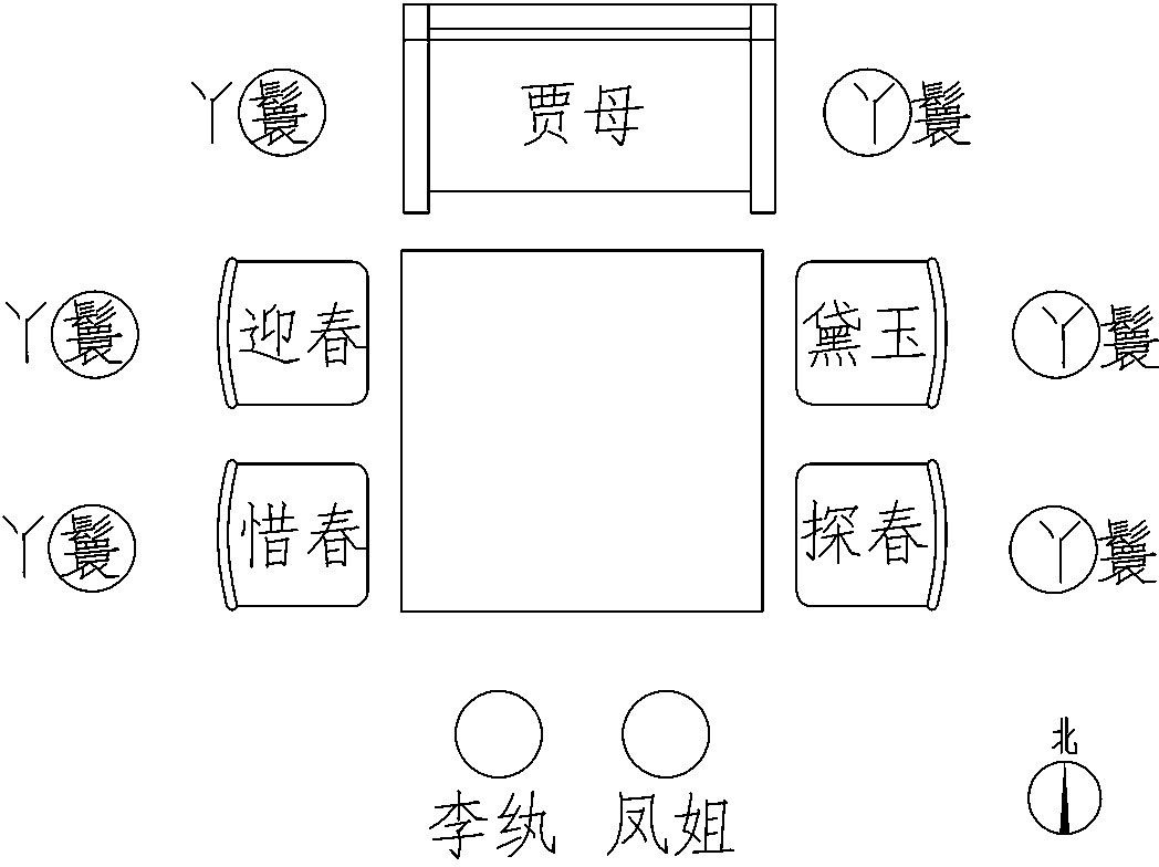 中国的饮食习俗是“合餐制”,大家团团围坐,共同进餐。在就餐的座次上体现着鲜明的伦理次序。传统中坐北朝南是最尊贵的位置,所以当然归于贾母。按照“左为上”的原则,左侧次尊贵,所以第三回里凤姐让黛玉(客人)坐左上第一席。左边坐了,才是右边,依次挨下去。第七十一回贾母做寿:“上面两席是南、北王妃,下面依叙,便是众公侯诰命。左边下手一席,陪客是锦乡侯诰命与临昌伯诰命;右边下手一席,方是贾母主位。邢夫人王夫人带领尤氏凤姐并族中几个媳妇,两溜雁翅站在贾母身后侍立。林之孝赖大家的带领众媳妇都在竹帘外面伺候上菜上酒。周瑞家的带领几个丫鬟在围屏后伺候呼唤。凡跟来的人,早又有人管待别处去了。一时台上参了场,台下一色十二个未留发的小厮伺候。”对就餐者座次的描述是极其详细的,宴席的座位格局体现出地位的尊卑和长幼的次序。