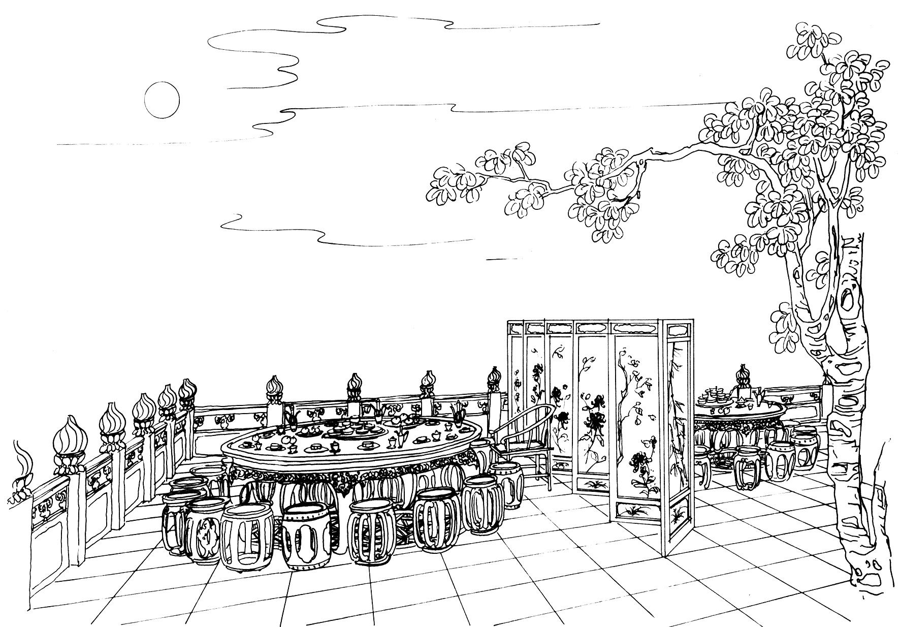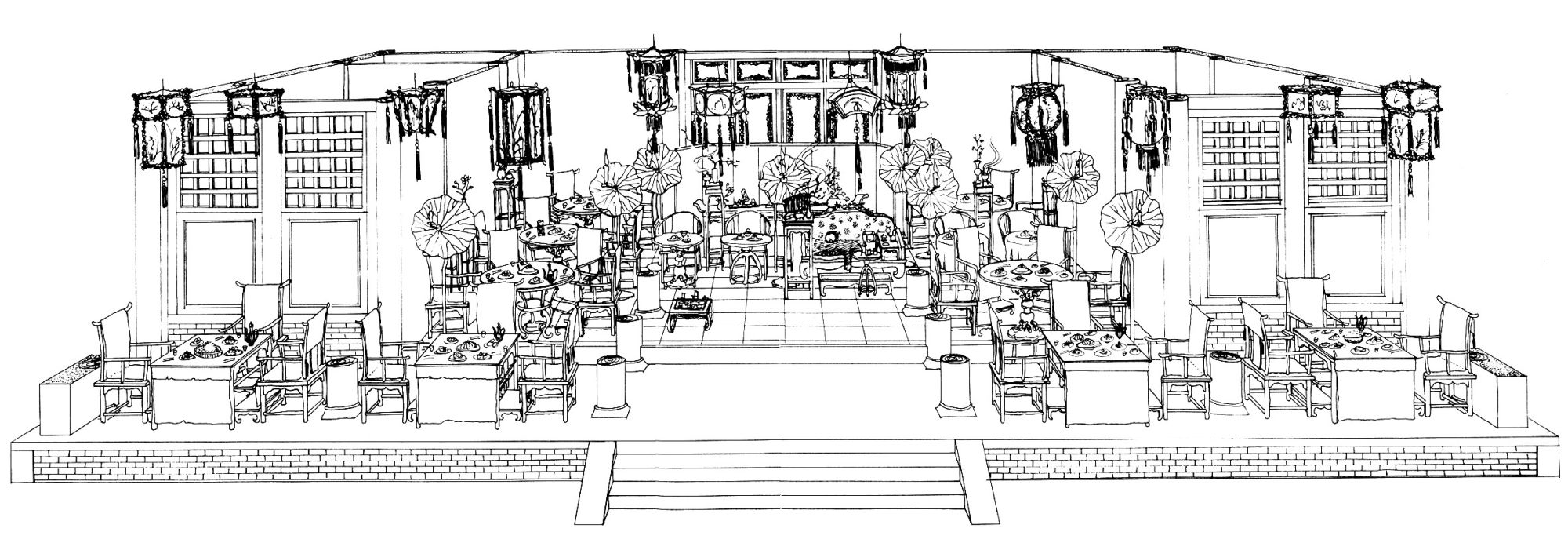 不同于日常家宴位置的固定,游宴以娱乐为主,随境而安,均是根据宴客的性质不同,规模大小不等,适时择地而设,调动的家具也有多有少。第三十八回众人在大观园藕香榭处设螃蟹宴,花香水声,明月当空,既有情调,也觉自由。就餐者人数众多,所以分成三桌,在座次上也仍有高低贵贱之分,但就餐氛围已轻松愉悦得多了。丫环女佣们也被允许在游廊和桂花树下设席用餐。大观园的游宴冲破了肃穆的谨严,有些自由随心的乐趣。