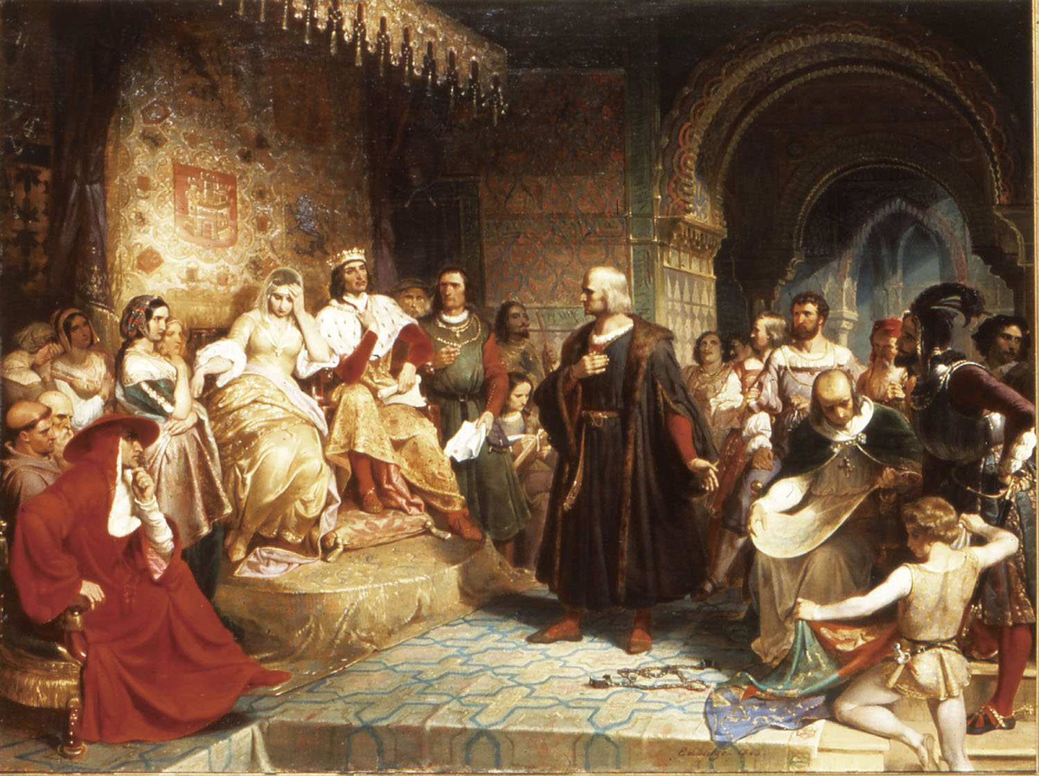 1486年费尔南多和伊莎贝拉就已知悉哥伦布的西航报告。经过六年的探讨,这个计划才在国王的支持下得以实施。哥伦布先后四次西航,分别是1492—1493年、1493—1496年、1498—1500年和1502—1504年。他1492年初登新大陆的10月12日,后来被西班牙定为国庆日。这幅由伊曼纽尔·鲁茨(Emanuel Leutze)创作的《在国王前面的哥伦布》,描绘了第三次航行返回的哥伦布,正在向西班牙君主费尔南多和伊莎贝拉介绍自己向西航行寻找印度的传奇经历。作为一个探险英雄,他被安排在画面中央。