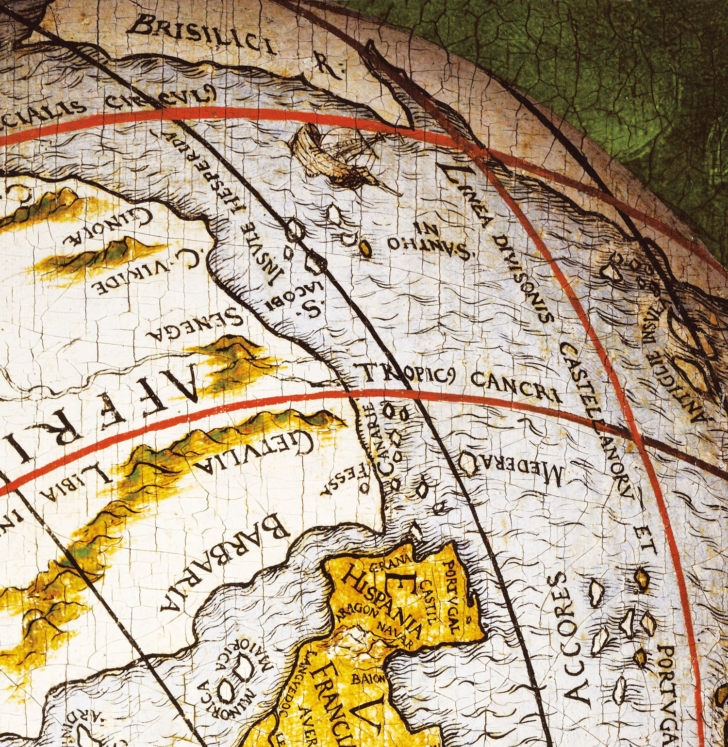 地球仪上的这条红线反映的是《托尔德西里亚斯条约》划定的大西洋子午线。这个地球仪的另一面还应有一条线,即1529年罗马教廷裁判的《萨拉戈萨条约》划定的太平洋子午线,因为此画绘制于此条约签订后的1533年。