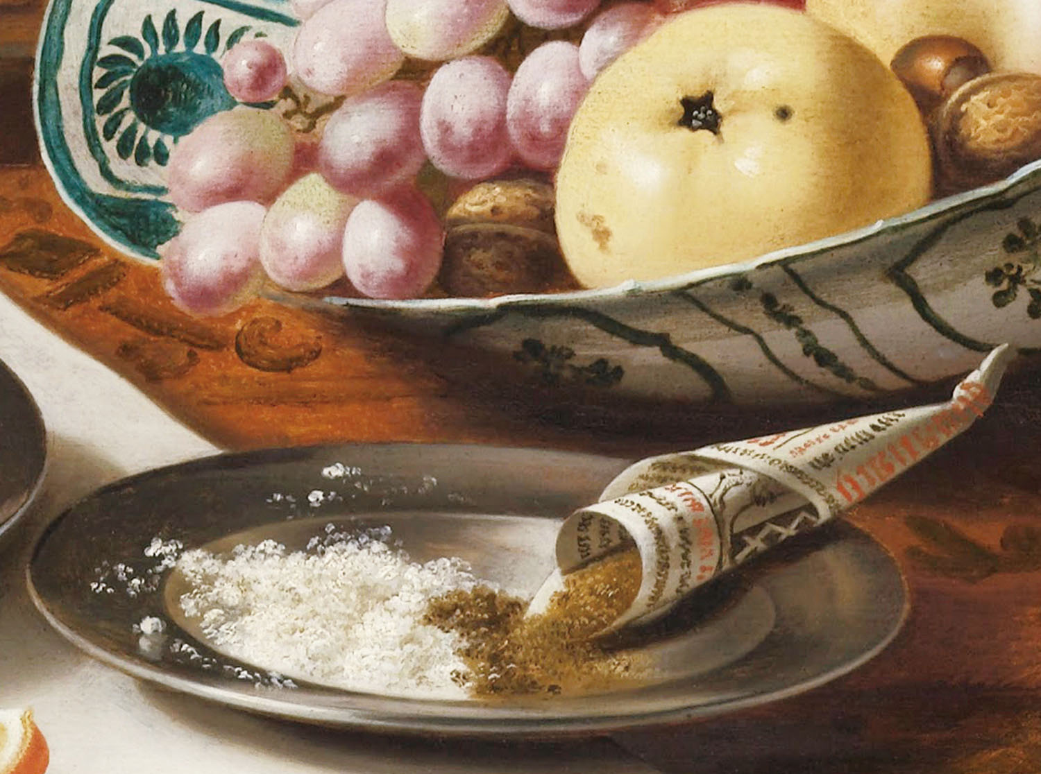 这幅画的作者是彼得·克莱兹(Pieter Claesz),他出生在安特卫普东南郊的贝尔赫姆。安特卫普是新兴的海上贸易货品集散地,也是香料的批发市场。克莱兹是一位静物画家,最拿手的是当时流行的“早餐画”“晚餐画”。这幅画简单翻译过来就是《火鸡派和万历果盘》,创作于1627年。这个时间很重要,它间接记录了胡椒的“没落”。请留意画的右下角,那个盘子中,白色的粉末是食盐,黑色的粉末是胡椒面。胡椒面用一张纸卷着,随意地与食盐一起撒在盘面上,可能是配火鸡派的调料。克莱兹的画光线柔和,细节处理微妙,看上去静如止水,可细细考证也有“波澜”——胡椒就这样“没落”了。