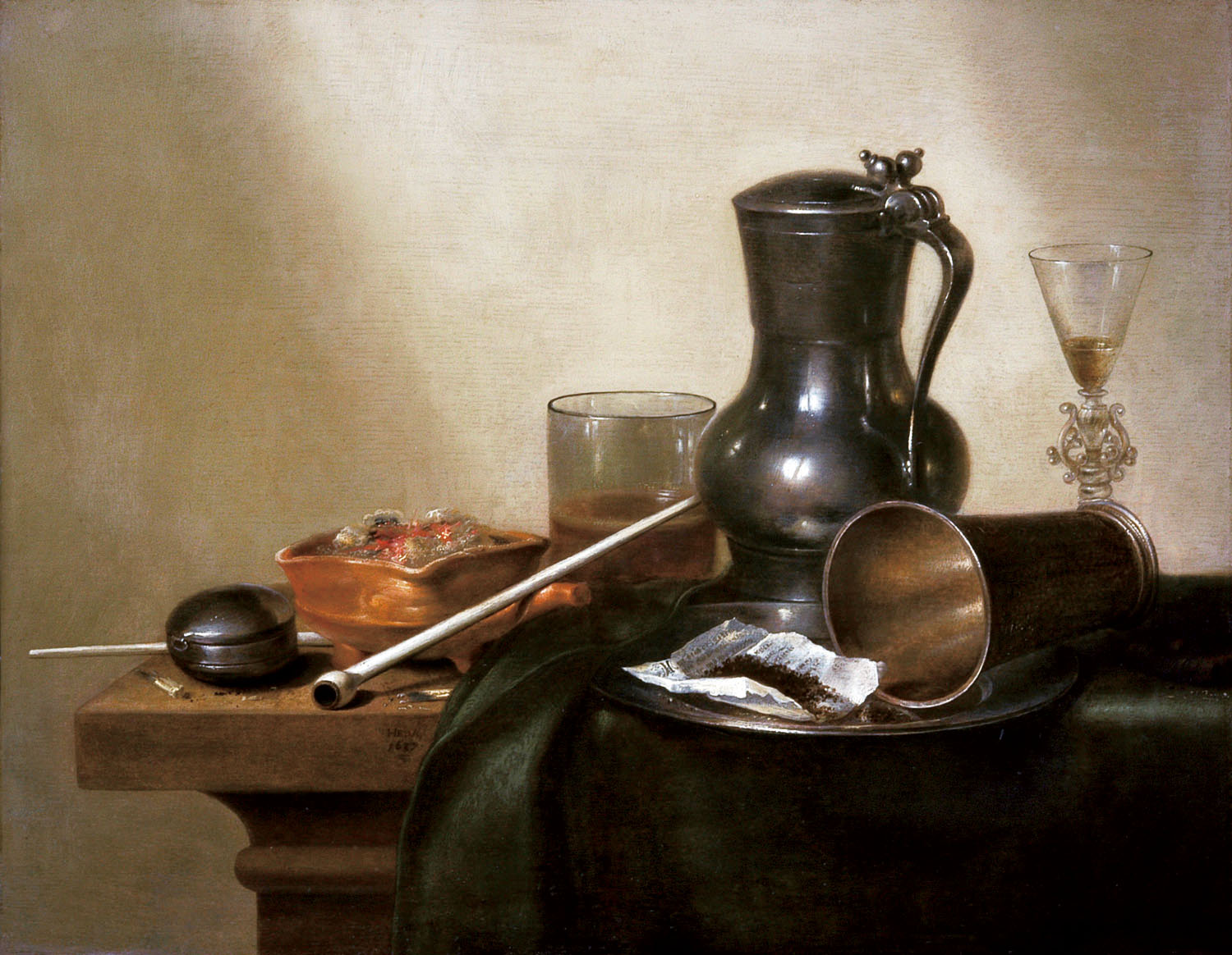 海达一生画了许多静物画。在这幅1635年的《镀金杯、锡壶与烟斗》静物画中,海达无意之间为我们留下了早期吸烟工具的很多线索。比如,红陶炭火盆、盛烟草的金属小盒子,还有长长的白色烟斗(在欧洲,绝大部分国家用烟斗吸烟,唯有法国使用鼻烟,还发明了鼻烟壶)。