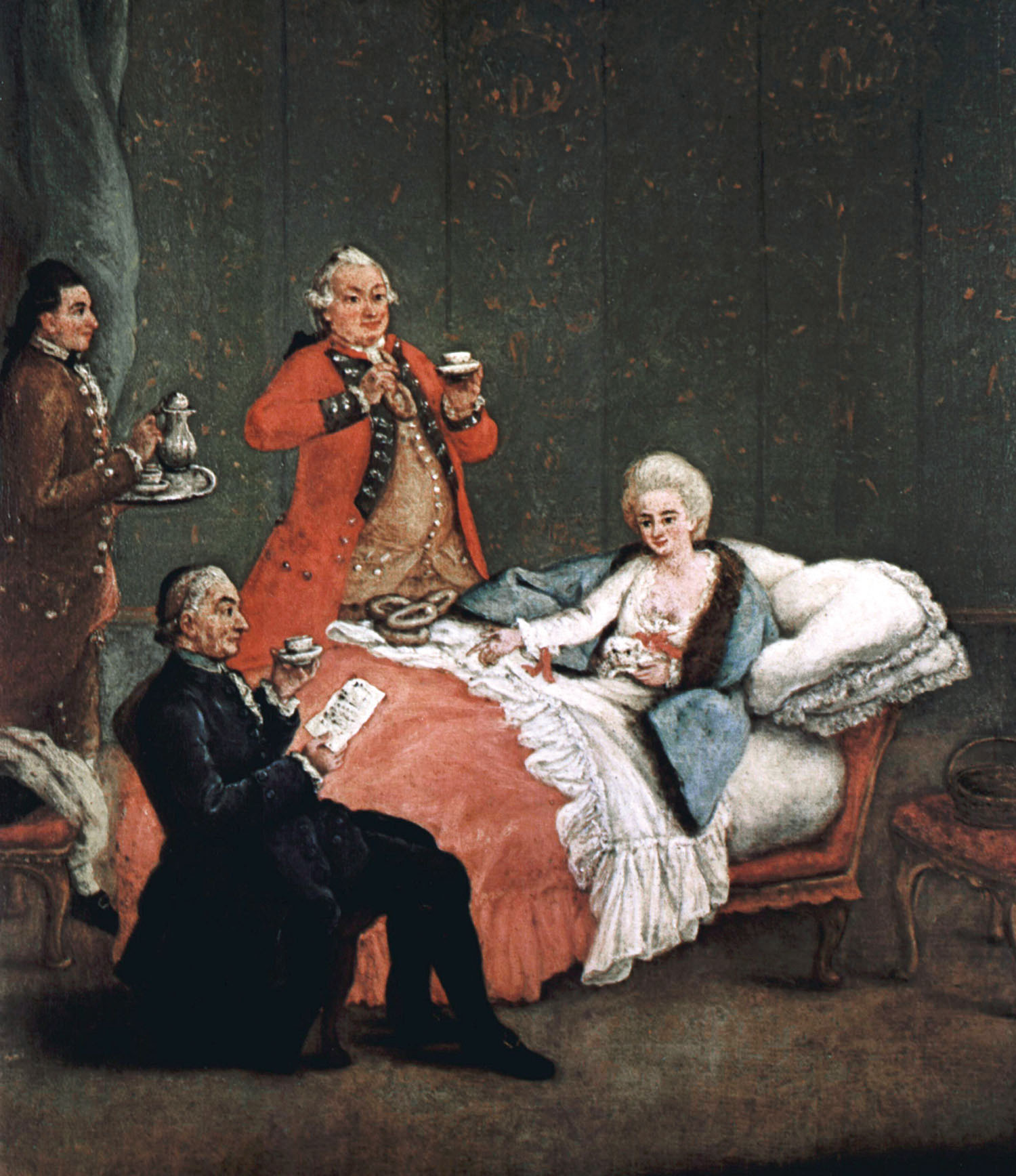 18世纪的意大利不太流行风俗画,但威尼斯是个例外,这里产生了一种专门描绘上流社会的风俗画,它的代表人物中就有彼得罗·隆吉(Pietro Longhi)。他最初利用湿壁画的技法从事祭坛画的创作,可能意识到自己对大型绘画缺少才能,遂转攻小型风俗画,很快显出这方面的才能。《早晨巧克力》绘于1775年至1780年间,是隆吉表现上流社会风俗画的代表作品。他描绘了一个贵妇人早晨起来,靠在贵妃椅上,与几位客人一边谈话一边饮着巧克力;贵妇人喝完后,仆人将碗与碟收到大托盘上,两位绅士还在边饮边聊。隆吉在风俗画不景气的年代里,算是一位较成功的风俗画家,作品很受贵族和小市民的欢迎。