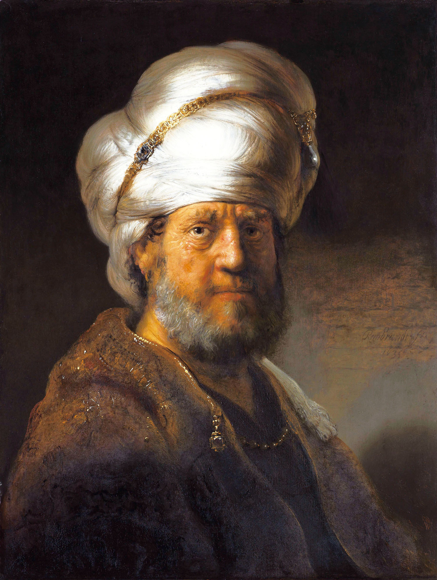 2007年10月,伦勃朗画的《东方人》第一次来到东方,在中国上海展出。在明暗对比强烈的“酱油调”中,一位东方老人华丽亮相:他身着东方长袍,蓄着漂亮的胡子,裹着白色丝绸包头,包头上装饰着黄金和宝石等饰物……那是一个气宇不凡的富商形象。