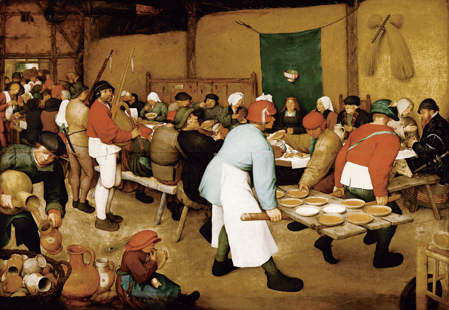 东方奢华的瓷器,尼德兰人用不上,也用不起,和当时欧洲其他国家一样“自力更生”仿制中国瓷器。尼德兰生产的瓷器,严格讲算不上瓷器,而是陶器。这种产品自然也上不了贵族生活的台面,但却不影响农民使用,甚至出现在农民的婚礼上。这种场景恰被尼德兰最伟大的画家彼得·勃鲁盖尔(Pieter Bruegel)以绝妙手法记录了下来。