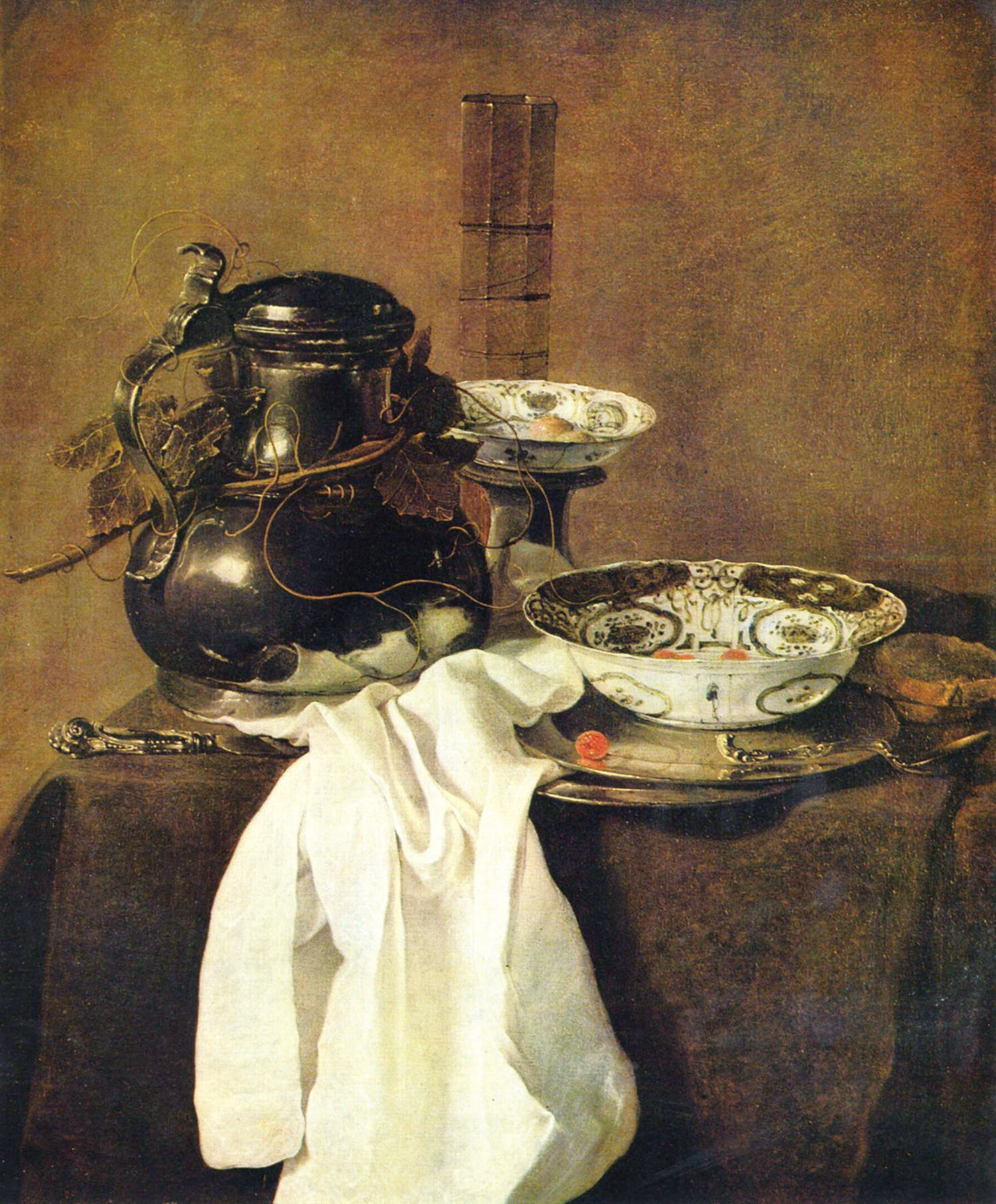 ——《万历瓷碗、玻璃杯、锡酒壶、橄榄和餐巾》崔克 1645年