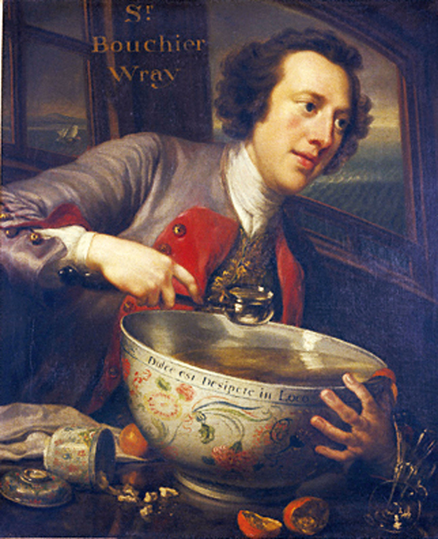 如果在这幅画中还看不太清“潘趣碗”的样子,那么,可以再看一幅英格兰肖像画家乔治·纳普顿(George Knapton)1744年绘制的《第六男爵鲍彻·莱肖像》。这幅画描绘了鲍彻·莱正在一条海上服役的船上,一手捧着巨大的“潘趣碗”,一手拿着长长的酒勺。这只大瓷碗有着清康乾“广彩”瓷器的华贵特色,在碗边上题写着不知是来样要求烧制的诗句,还是画家根据画意的需要自己添上去的诗句。它出自古罗马诗人贺拉斯《颂歌集》的最后一行诗句“Dulce est Desipere in Loco”,意思是“在适合的时机表现得很愚蠢是甜蜜的”。