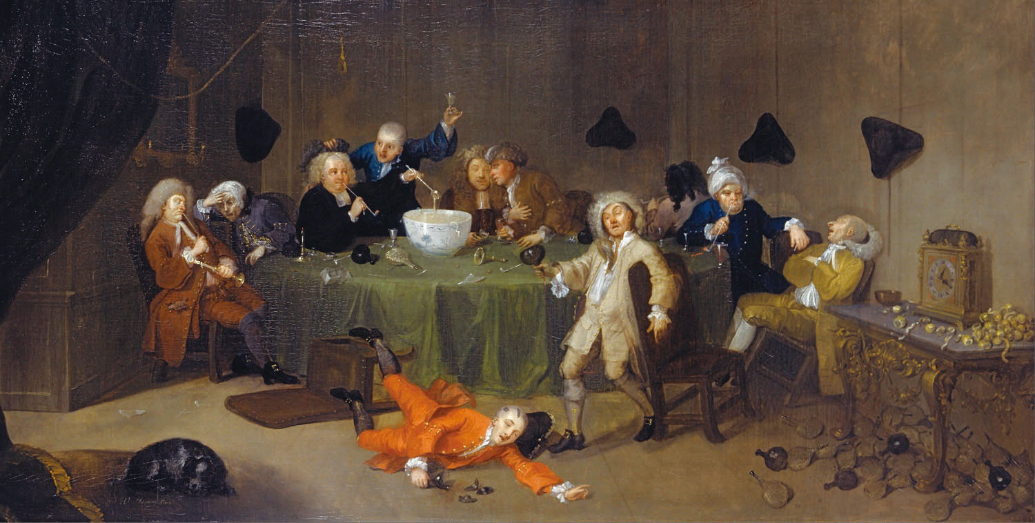 这种调酒法和用酒勺喝酒的方法,17世纪初先是在荷兰东印度公司的水手中流行,后来传入了英格兰,成为一种饮酒时尚。不妨来看一看威廉·贺加斯1732年创作的《摩登的午夜聚会》,画面中央是一只脸盆大的“潘趣碗”,这种瓷碗最初都是中国制造或从中国定制的,喝酒时,或用长勺,或用酒杯,你一勺、我一杯地自斟自饮。虽然“潘趣酒”是度数不高的果酒,但喝多了也醉得不轻。瞧瞧画上的这些绅士,身边的小酒瓶子已在墙角堆成小山,戴着假发或抛掉了假发的绅士们,已经东倒西歪,地上倒着一个醉鬼……