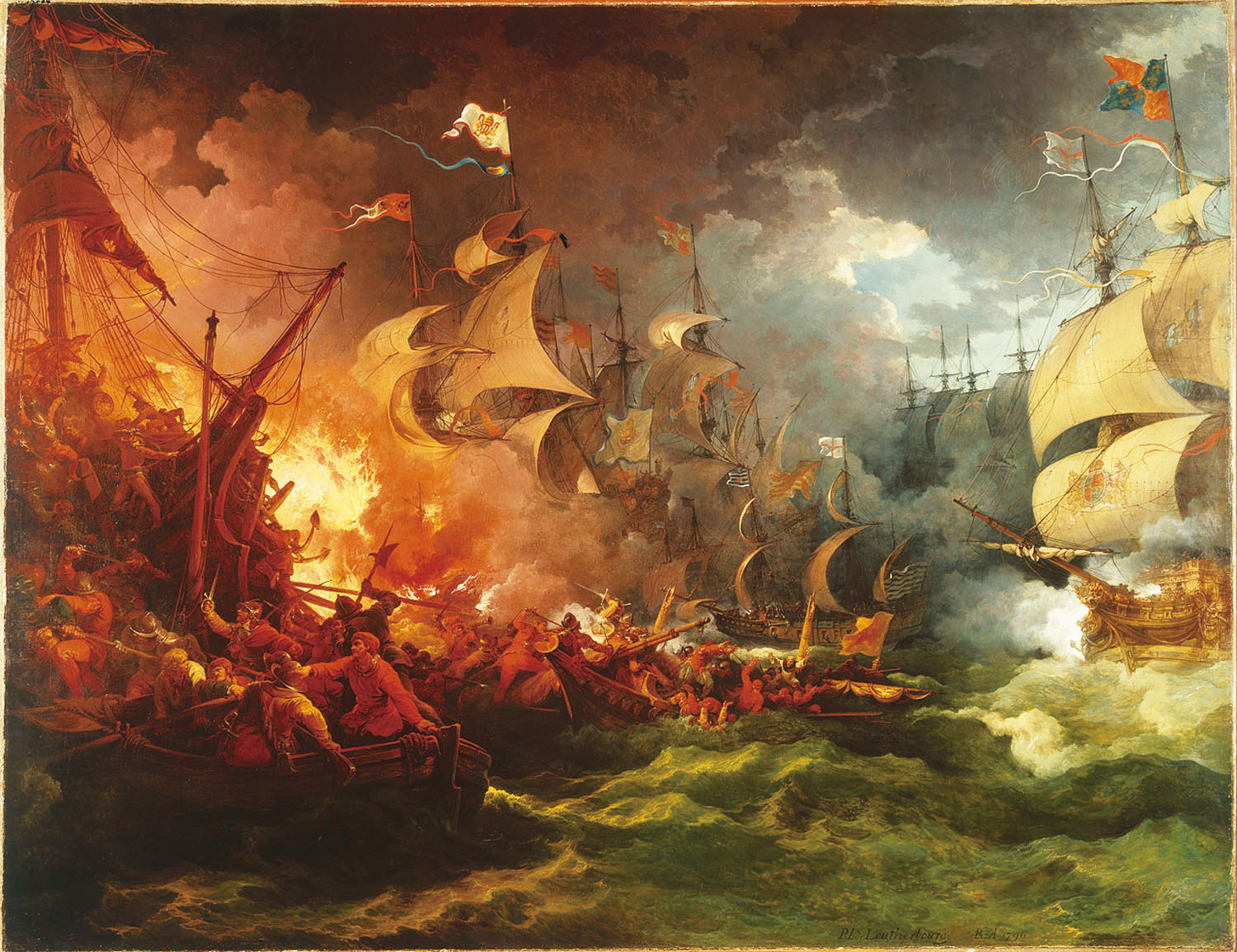 这幅《西班牙无敌舰队的覆灭》是英格兰历史画画家菲利普·詹姆斯·德·劳瑟堡(Philip James de Loutherbourg )1796年创作的高214.63厘米、宽278.13厘米的大型画作。虽然它是战斗过后200多年的作品,但画面气势恢宏,有很强的戏剧性,常被各方引用,遂成经典。我在英国国家海事博物馆参观时,见过这幅大作,确实值得驻足品味。这位历史画画家的代表作有两幅:一幅是《西班牙无敌舰队的覆灭》,另一幅是《1666年伦敦大火》。或许他偏爱表现大火,1588年8月8日的这场战火,画得有点“过火”了。
