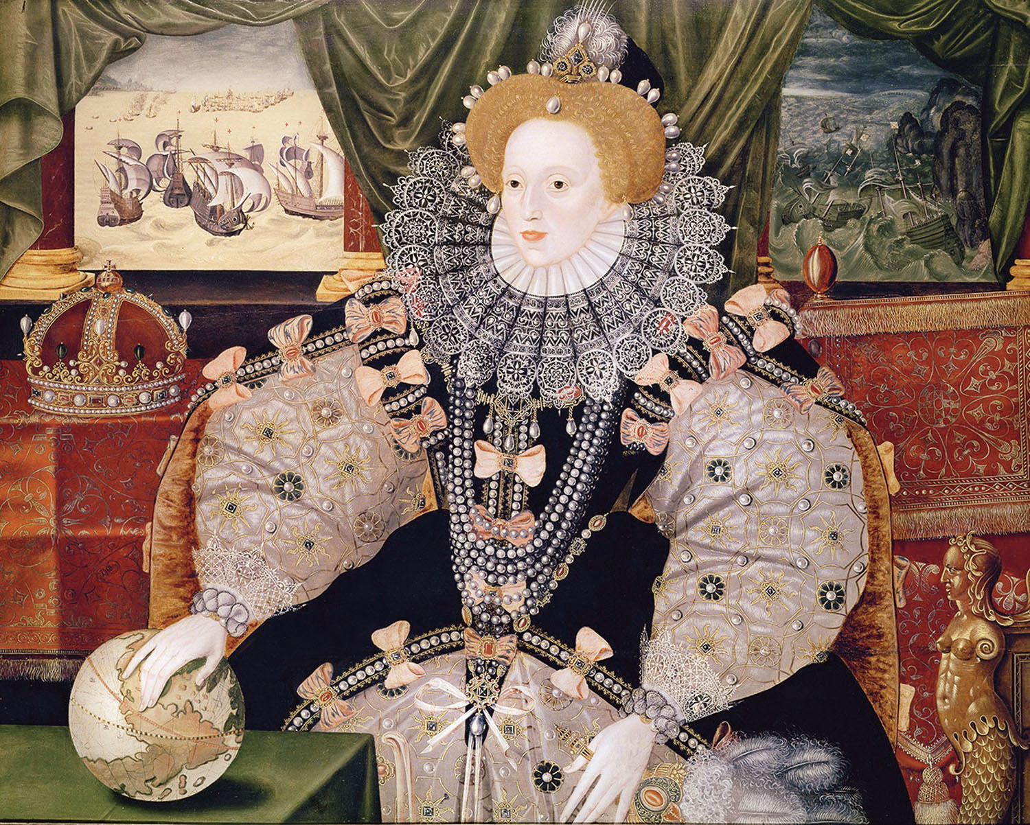 这幅寓言式油画的主角是斗志昂扬的伊丽莎白,王冠放在一边,搭在地球仪上的手覆盖着美洲,借以显示女王在全球范围内的控制力。女王之外不可忽略的内容是,左上方框中得胜的英格兰舰队和右上方框中落败的西班牙舰队。伊丽莎白女王与皇家海军的密切关系由此显现。