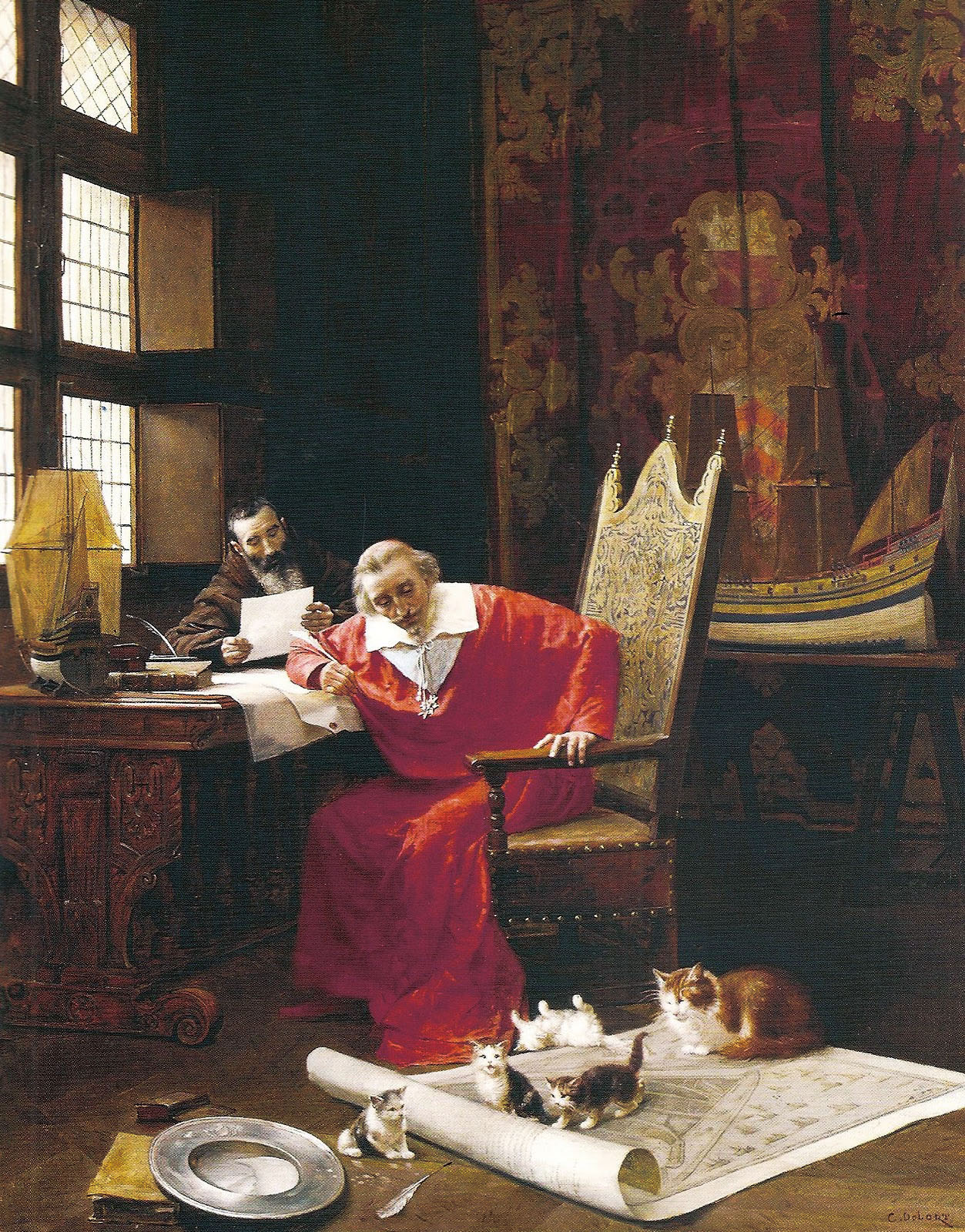尚帕涅画的黎塞留肖像,逼真而亲切,但缺少故事。我更喜欢18世纪法国画家查尔斯·爱德华(Charles Édouard Delort )画的《黎塞留与神父约瑟夫和宠物猫》,它不仅完美表现了黎塞留的艺术形象,还适合用来讲黎塞留和法国海军的故事。