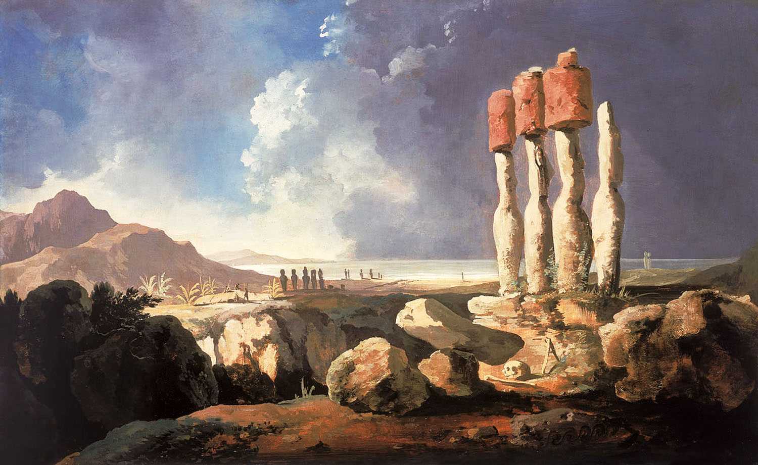 1776年霍奇斯根据在复活节岛绘制的草图,回国后完成了这幅高76厘米、宽120厘米的风景画。其主体即是神秘的巨型石像“莫埃”(moai,石像的意思),在这些细长半身人像的头顶还有圆柱形“普高”(pukao,意为头饰)。专家们考证,这个岛上有上千个石雕像,它们代表死后被奉为神的重要人物。石像一般高5—10米,重几十吨,红色石帽重达10吨左右。画中近景描绘了一个骷髅头,画家或是想借此显示岛上有久远的人类活动。库克他们到达这里时,此地还处于石器时代,当地的波利尼西亚人只有语言,没有文字。后来,这片神奇的土地归属于离它3600多公里的智利。