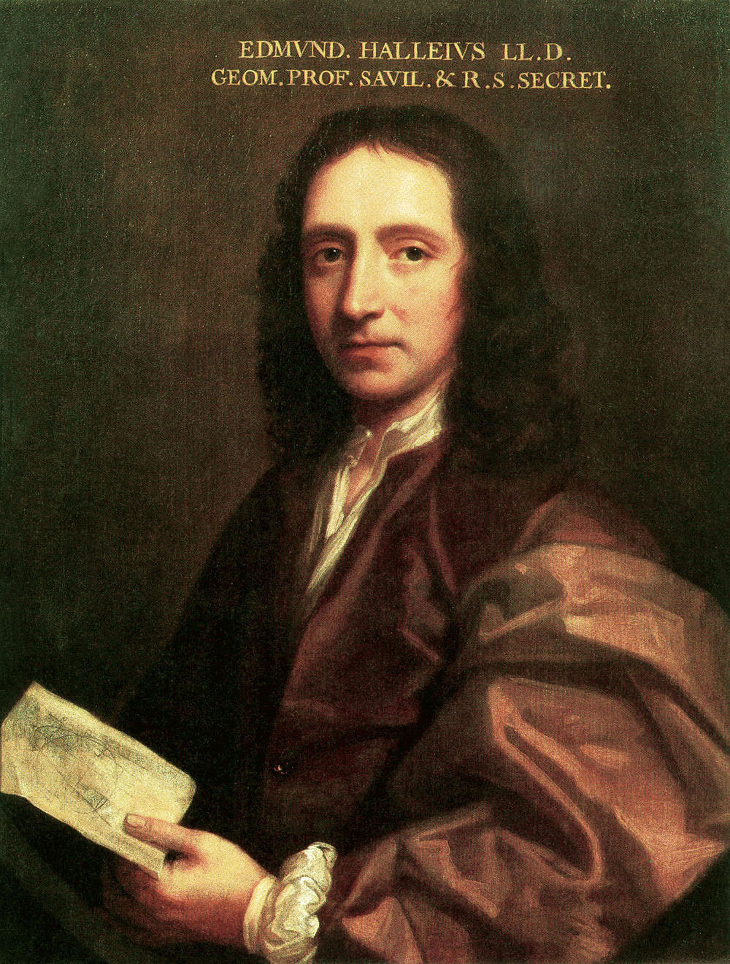 哈雷的这幅肖像大约绘制于他成名后的1687年,作者是苏格兰肖像画家托马斯·穆雷(Thomas Murray),他是绘画大师约翰·莱利的学生。据说,穆雷是“一张脸画家”,他只完成脸部,其余部分由学生来完成。不知这幅画是不是这样,但画中哈雷手里的那张纸还是挺有意思的。我请教上海交通大学讲席教授江晓原先生。他回复说:“图看不太清,可能是彗星轨道示意图。彗星轨道分为椭圆、双曲线、抛物线三种类型,此画显示的似乎是一个抛物线和一个圆,可以理解为探讨彗星的情形。”它至少是一幅天文图,画家是想以这一“焦点”折射出主人公的专业背景和追求。后来,还有其他画家给成名后的哈雷画肖像,但皇家学会悬挂的则是穆雷画的这一幅,可谓哈雷肖像画中的“名画”。