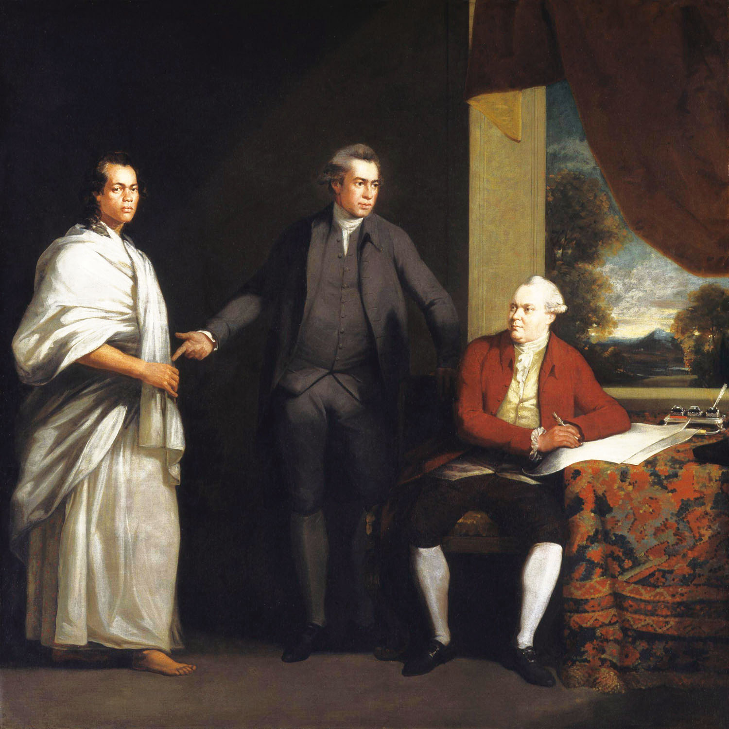 不能遗漏的是,库克第二次太平洋航行虽然没有带上班克斯,但1775年返回英国时,却为班克斯带回来一个塔希提青年奥麦。很快班克斯就请人画了这幅他在林肯郡家中与奥麦交谈的画。画上的奥麦被精心打扮了一番,上身是褐色外套,下身着白色缎子礼裤,但打着赤脚,似乎表明这是一位“高贵的野蛮人”。索兰德已发福了,坐在桌边在记录这个红褐色的“标本”。奥麦在随库克船长第三次太平洋考察回到家乡之前,一直是上流社会的宠儿,被班克斯带着参加各种聚会,甚至还见了乔治三世国王。