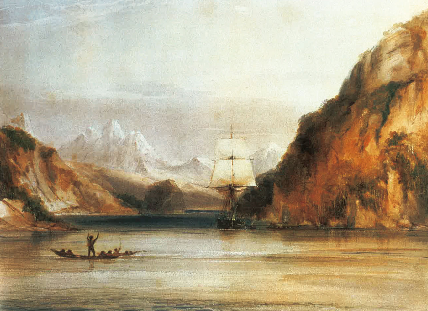 马滕斯的父亲是奥地利驻伦敦的领事和商人,但马滕斯没有继承家传的经商本领,而是另寻出路学习水彩画。马滕斯擅长海景画,这幅《贝格尔号在火地岛》即是以海景画的形式记录了贝格尔号在火地岛南部海峡航行的场景。现在这一水域被称为“贝格尔水道”。2007年,我在乌斯怀亚考察,曾乘船在这里转了一圈,小岛上到处都是密集的鸬鹚、海豹、海狮……可以想象达尔文当年有多激动。如今,这里的动物变化不大,但人“进化”得太快了,火地岛的原住民已绝种。画中出现的原住民和他们划的小船——这个世界尽头的古典景象——永远定格在马滕斯的画面中。