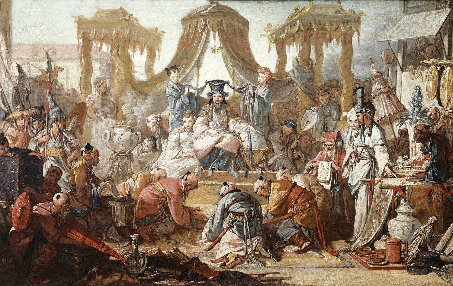 显然,布歇分不清楚中国的元、明、清三朝,更无法见识紫禁城。他的《中国皇帝上朝》画的清朝皇帝,不像清朝的皇帝,也不像明朝的皇帝。中国皇帝也不会在园林中“上朝”,更不会手抚地球仪处理中国朝政。