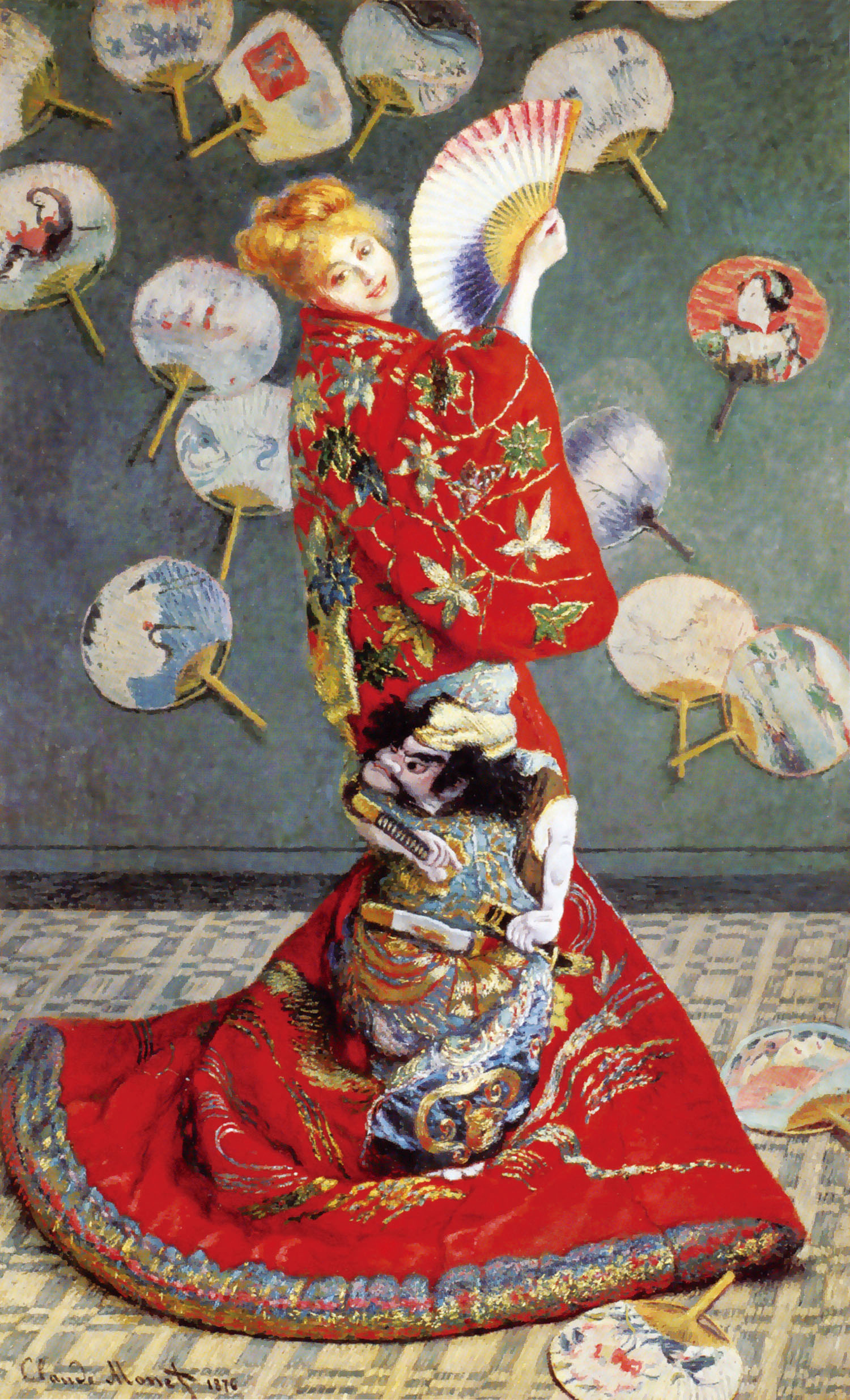 像《印象·日出》是莫奈的风景画代表作一样,《穿和服的女人》则是他的人物画代表作,其中的东洋味道耐人寻味。画中的卡米耶扮成一位手持折扇、身穿和服的金发少妇,背景墙上挂着15把日本团扇。这一次“印象”大师莫奈没以虚写手法描绘这一东洋场景,而是以写实手法对环境进行了细致描绘。如和服面料中金丝、银线的纹饰,还有刺绣能剧人物,不仅鲜亮,而且有立体感。少妇脚下的日式榻榻米,不仅质感强烈,上面的纹路和缝隙也被画家作了逼真的表现。团扇上的人物、动物与风景也都有精细的描绘。
