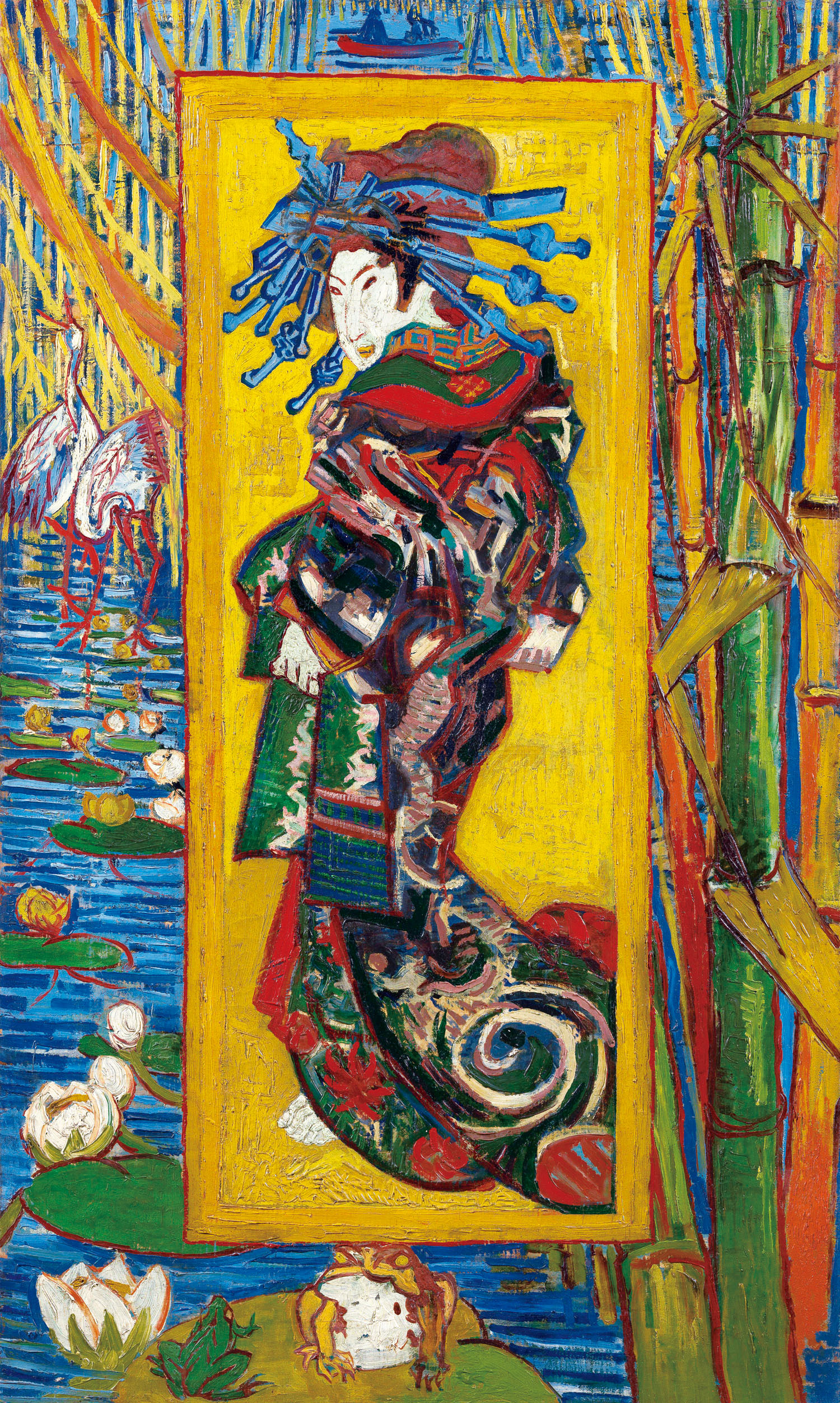 1887年凡·高画的布面油画《花魁》,临摹的是《巴黎画报》1886年“日本特集”封面上溪斋英泉美人绘《花魁》。在这幅画中,偏爱明快色彩的凡·高尽情挥洒了他对色彩的追求。这一年,凡·高还临摹过歌川广重(原名安藤广重)的《大桥骤雨》,细细体会浮世绘的“快笔触”如何表现雨水从空中划过。画框四周他加上了歪歪扭扭的汉字。现收藏在凡·高博物馆的《江户名所百景之龟户梅园》,也是凡·高临摹歌川广重的风景画名作。在这幅画中,凡·高体会了浮世绘于平面中表现远近的空间技法。细看此画,凡·高并不是简单照抄,他加重了前景树枝与景物间的透视关系,那两排歪歪扭扭的汉字,突出了画的装饰与纵深效果。