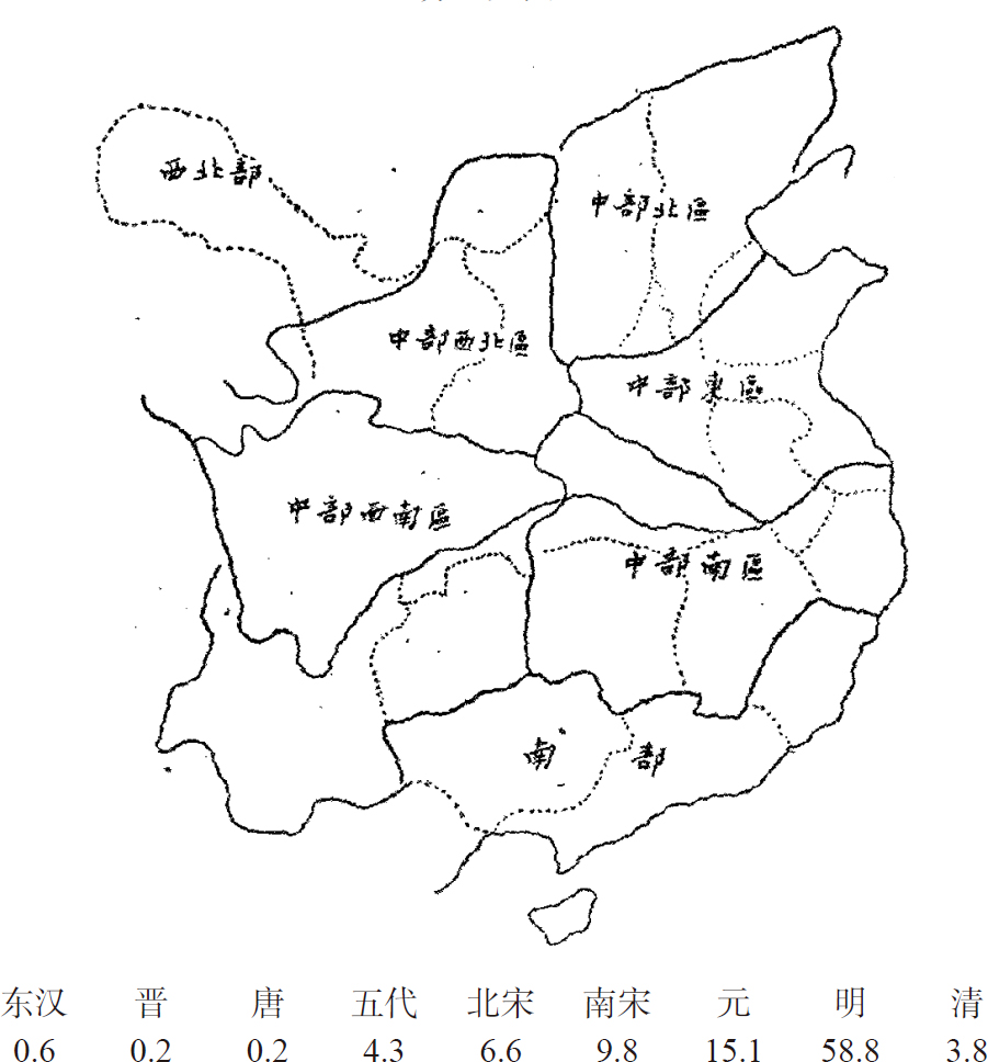 中原人口向南迁移始于何时,乃吾人之先决问题也。依李氏筑城区域之推测,华族势力及于江苏,湖北始于纪元前722年至纪元前206年,约当周末及秦代。及于安徽、江西、湖南、四川,则为纪元前206年至264年,约当汉代。(36)筑城区域所示者实为华族之政治势力,并不足以确定其有大批移民也。谭其骧先生研究中国内地移民史,曾将各时期客民移入湖南之人数比数,其结论如下:(37)