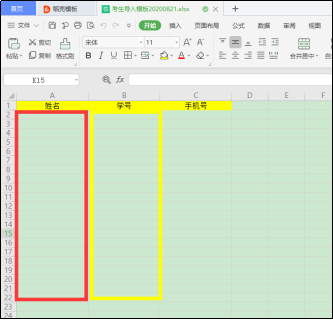 2)下载模板表并打开,在红框处粘贴学生姓名,在黄框处粘贴学生学号,手机号可不填写。