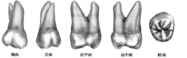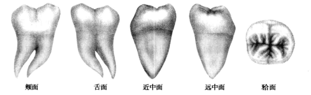 (1)颊面(图1-45):颊面外形为倒梯形,能目测到5个牙尖:近中舌尖、远中舌尖、近中颊尖、远中颊尖、远中尖,牙冠宽度>牙冠高度。