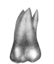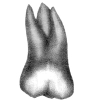 2.牙根 为双根,扁圆而厚,近中根与远中根分叉度小,彼此相近,根尖段皆偏向远中。有时两根可融合成一锥形根,亦有两根在颊侧部分融合,而舌侧仍分叉成为所谓的“马蹄根”(根的横剖面呈马蹄形)。极少数其近中根分成近颊根和近舌根,形成三根,这与下颌第一磨牙远中根分根情况有所不同。