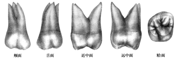 (3)邻面:颊尖与舌尖的差别较大,颊舌牙尖距离较近。近中面较宽且平直,远中面较近中面显著减小且圆突,近中边缘嵴高于远中边缘嵴。牙颈线向牙冠侧凸弯,近中颈曲度比远中高。