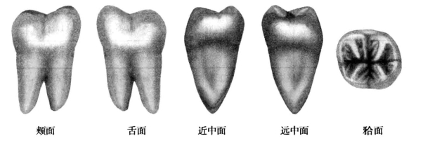 面为长方形。④牙尖多,一般为四、五个牙尖。⑤颊面的外形高点在颈1/3处,舌面外形高点在中1/3处。近、远中面接触区均为