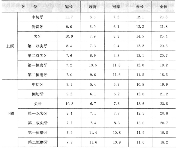 附:恒牙测量统计表(表1-3)