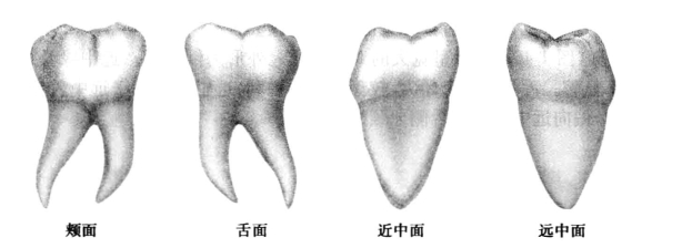 面形态与上颌第一磨牙明显不同:其颊面宽大,舌面因远中舌尖不同程度退化而明显小于颊面,