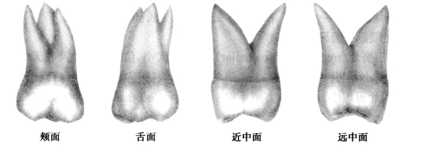 面上呈三尖型,即远中舌尖很小或消失,或似上颌前磨牙双尖型,或多尖型等。牙根多合并成一个锥形根,有时为多根型,根尖偏远中,但其牙根的大小、长短、数目、弯曲度及形态变异均很大。