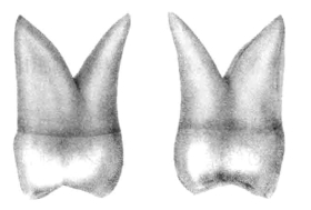 面见较大的中央窝和较小的远中窝,在中央窝的近中见较浅的近中点隙。中央窝的深度>远中窝的深度>近中点隙的深度,中央窝在中轴上,远中窝偏向舌侧。近中边缘嵴较远中边缘嵴长且清晰锐利。