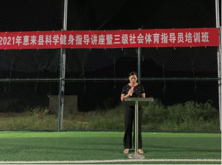为贯彻落实《广东省全民健身条例》,进一步加强全县社会体育指导员队伍建设,根据省、市开展社会体育指导员培训相关要求,以及局《2021年惠来县三级社会体育指导员培训计划》工作安排,由惠来县文化广电旅游体育局主办,县社会体育指导员承办的2021年惠来县科学健身指导讲座暨三级社会体育指导员培训班于9月25日晚在惠来县惠城镇飞合体育足球场正式开班。县文化广电旅游体育局副局长吴秋霞参加活动并发表讲话。培训活动由县社会体育指导员协会副秘书长方庆濠主持。本次培训班分为三期,培训内容包括理论和专项技能。