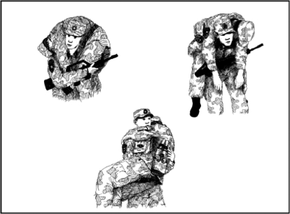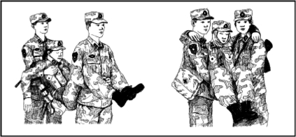 当伤员周围无敌人火力威胁、伤员伤势较轻时,可采用单人肩、单人背或单人抱法进行搬运(如图3-29所示)。