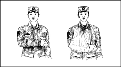 前臂尺桡骨骨折临时固定法用卷式夹板的头端从手背腕部推向肘关节,再将卷式夹板回返推向手心处,然后用两条三角巾条带分别在骨折两端绕肢体两圈固定,最后用一条三角巾将骨折肢体悬吊于胸前(如图3-28所示)。此处骨折也可用其他方法进行临时固定。