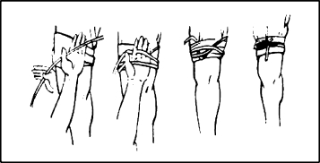 止血带是一种制止肢体出血的急救用品。常用的止血带是约1米长的橡皮管。一般在四肢大动脉出血用其他方法止血无效时,采用止血带。方法要诀是:橡皮带左手拿,后头五寸要留下,右手拉紧环体扎,前头交左手,中食二指夹,顺着肢体向下拉,前头环中插,保证不松垮(如图3-23所示)。