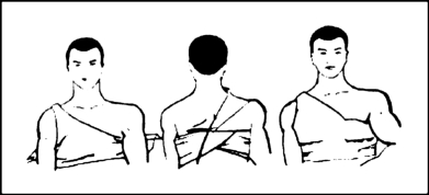 将三角巾的顶角放在伤侧胸部肩上,把左右两底角拉到背后打结,然后和顶角打结(如图3-26所示)。本方法也适用于背部包扎。